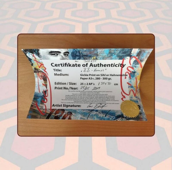 Dit werk is handgesigneerd, voorzien van een stempel en bijbehorend certificaat van echtheid. Het betreft een gelimiteerde oplage van wereldwijd slechts 25 exemplaren (genummerd 25/25). De kunstenaar verkoopt deze werken voor €169,00 per stuk.