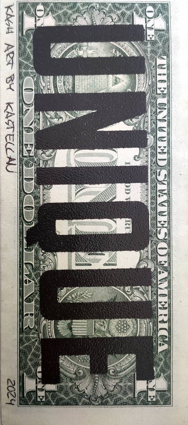 Kash Art by Kastellan. Dollar Art. Handwerk op een echt dollar biljet (6,6 cm x 15,6 cm). Gedateerd en handgesigneerd op de achterkant door de kunstenaar. Een uniek werk (1/1)! Inclusief een door de kunstenaar gemaakte envelop. Techniek: sjabloon en spuitbus.