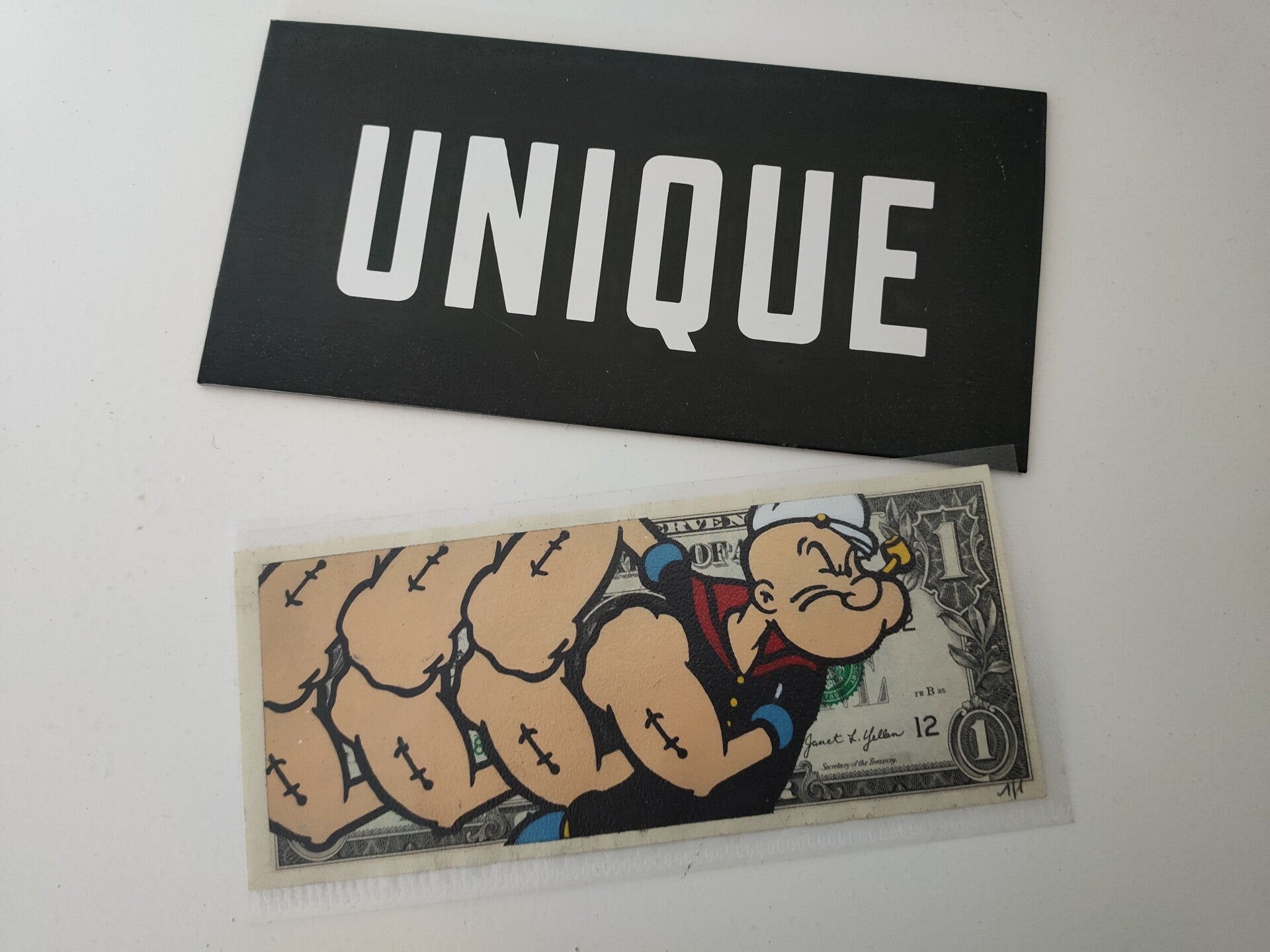 Kash Art by Kastellan. Dollar Art. Handwerk op een echt dollar biljet (6,6 cm x 15,6 cm). Gedateerd en handgesigneerd op de achterkant door de kunstenaar. Een uniek werk (1/1)! Inclusief een door de kunstenaar gemaakte envelop. Techniek: sjabloon en spuitbus. Street Art.