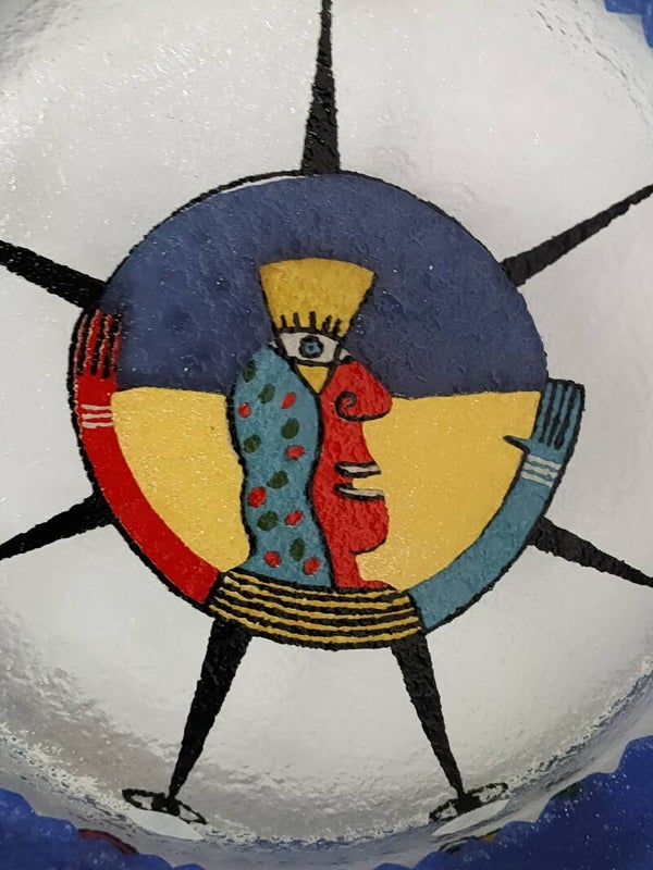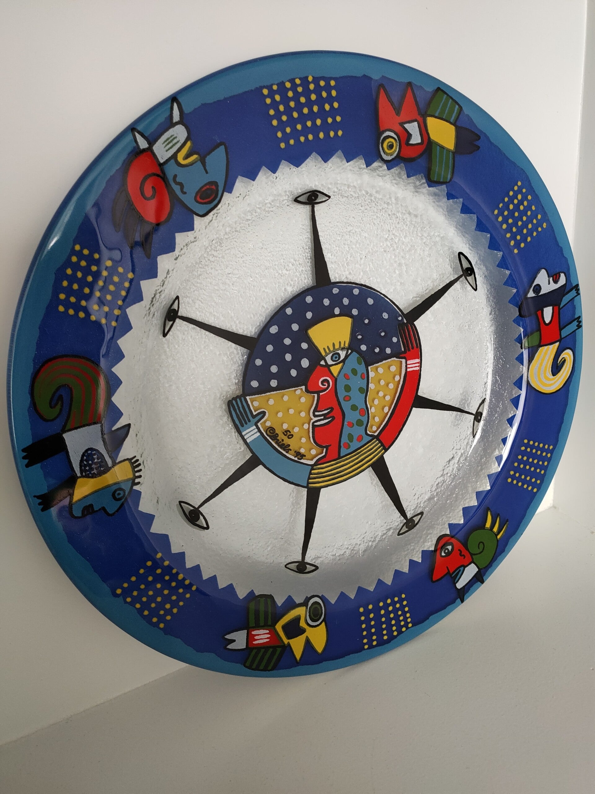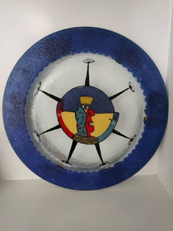 Decoratief glazen bord met een diameter van 33 cm. Meerkleurig en uitstekende staat.