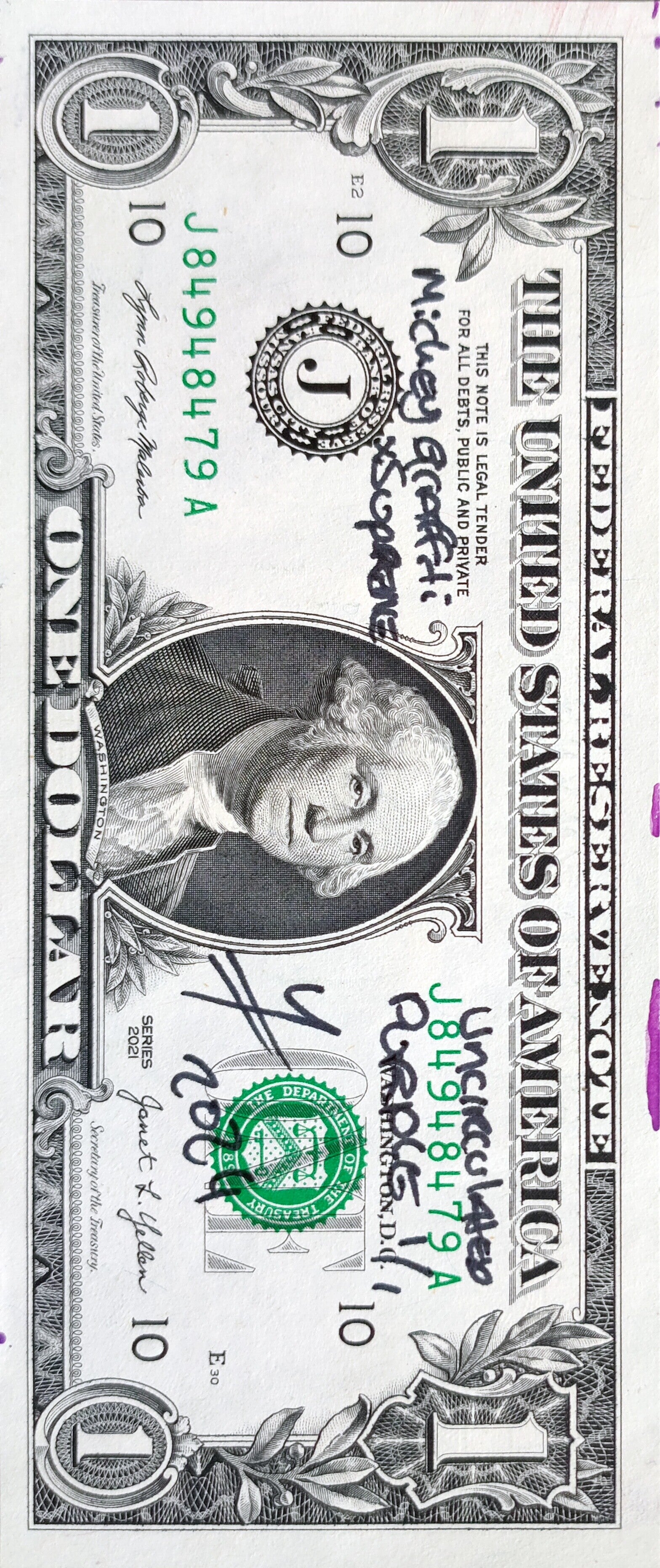 Acrylic Spraypaint op een echt dollar biljet (uncirculated).