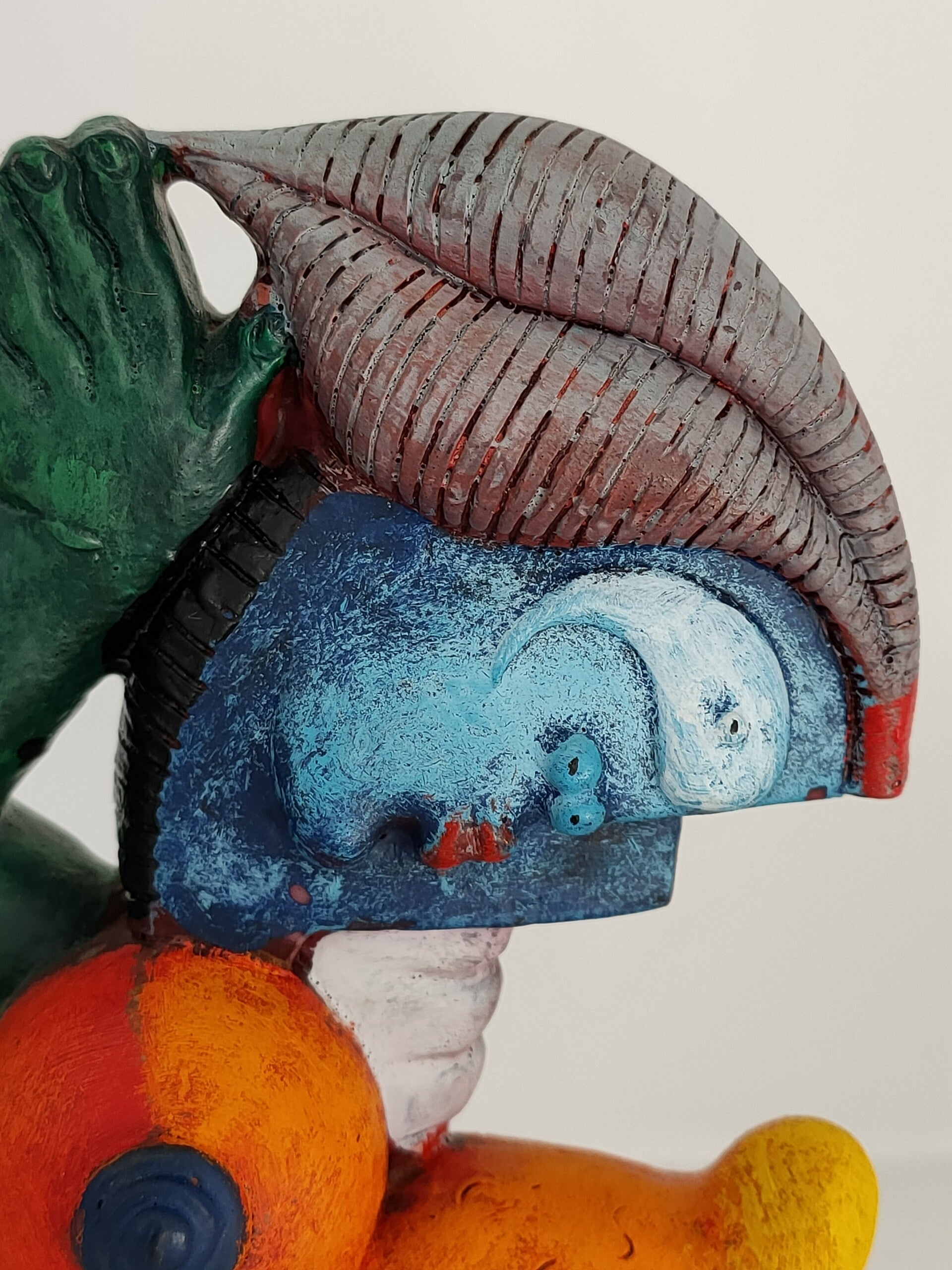Beeldje van acryl kunsthars van kunstenaar Clemens Briels. Handgeschilderd en handgesigneerd. Afmetingen: 16 cm H, 10 cm B en 6 cm D.