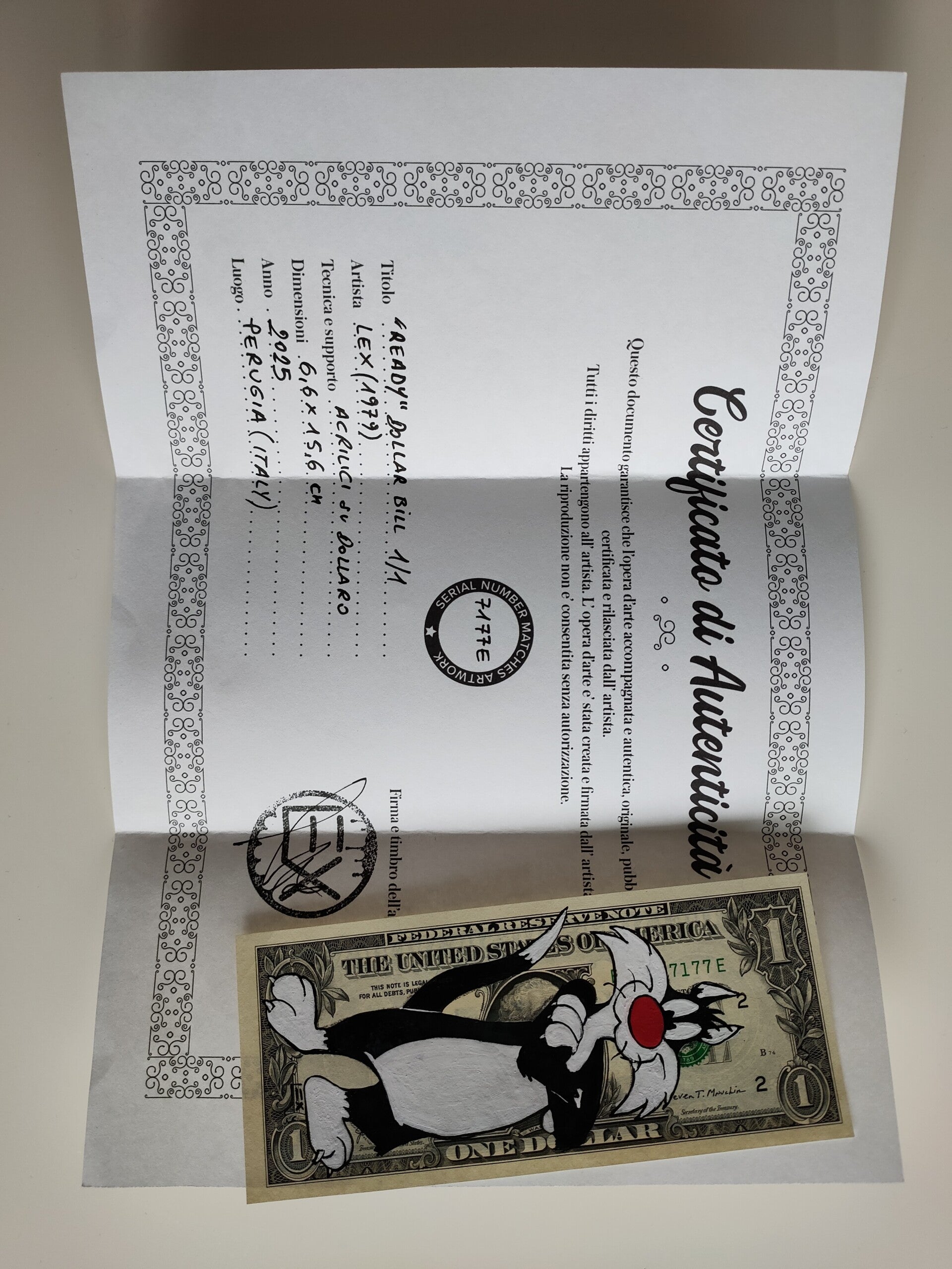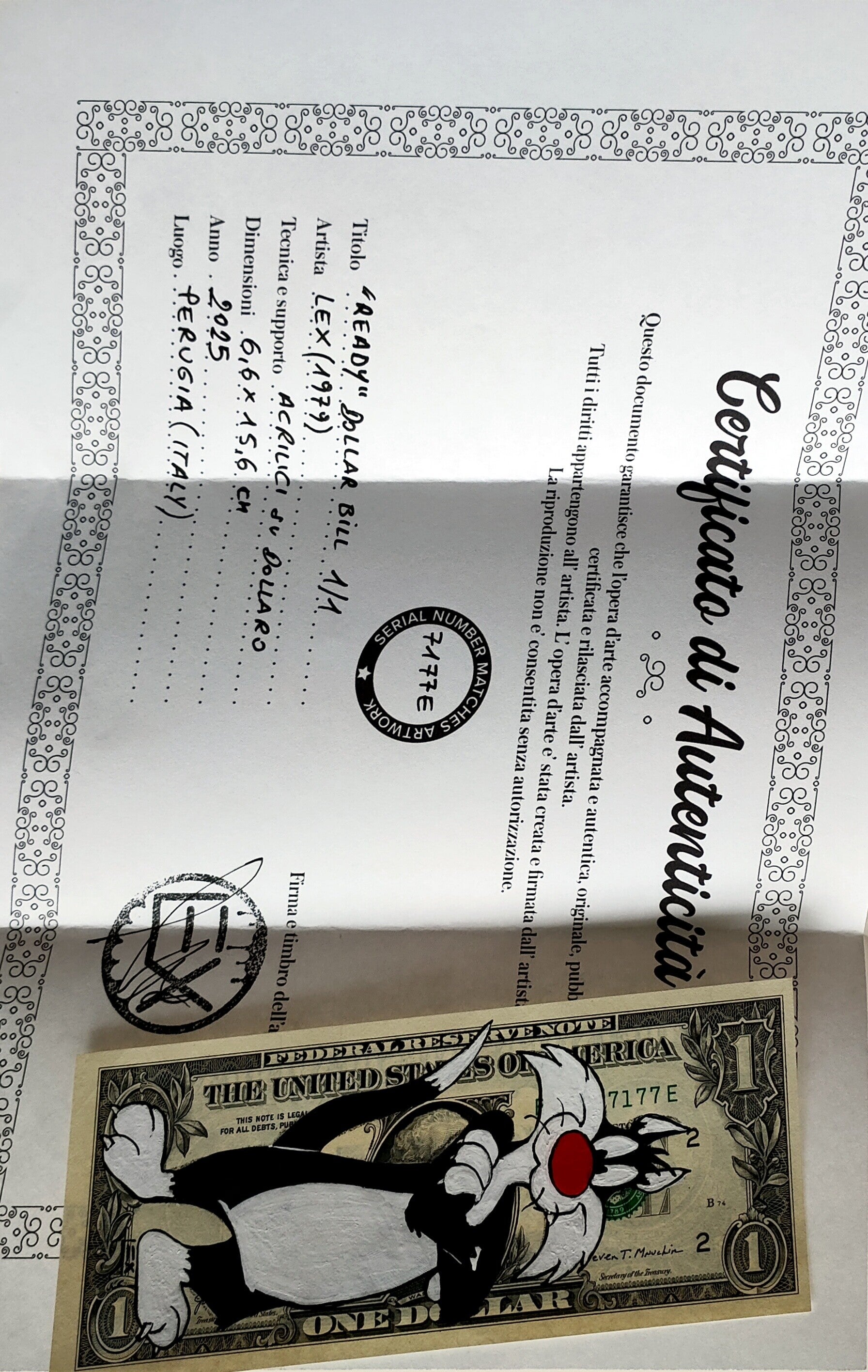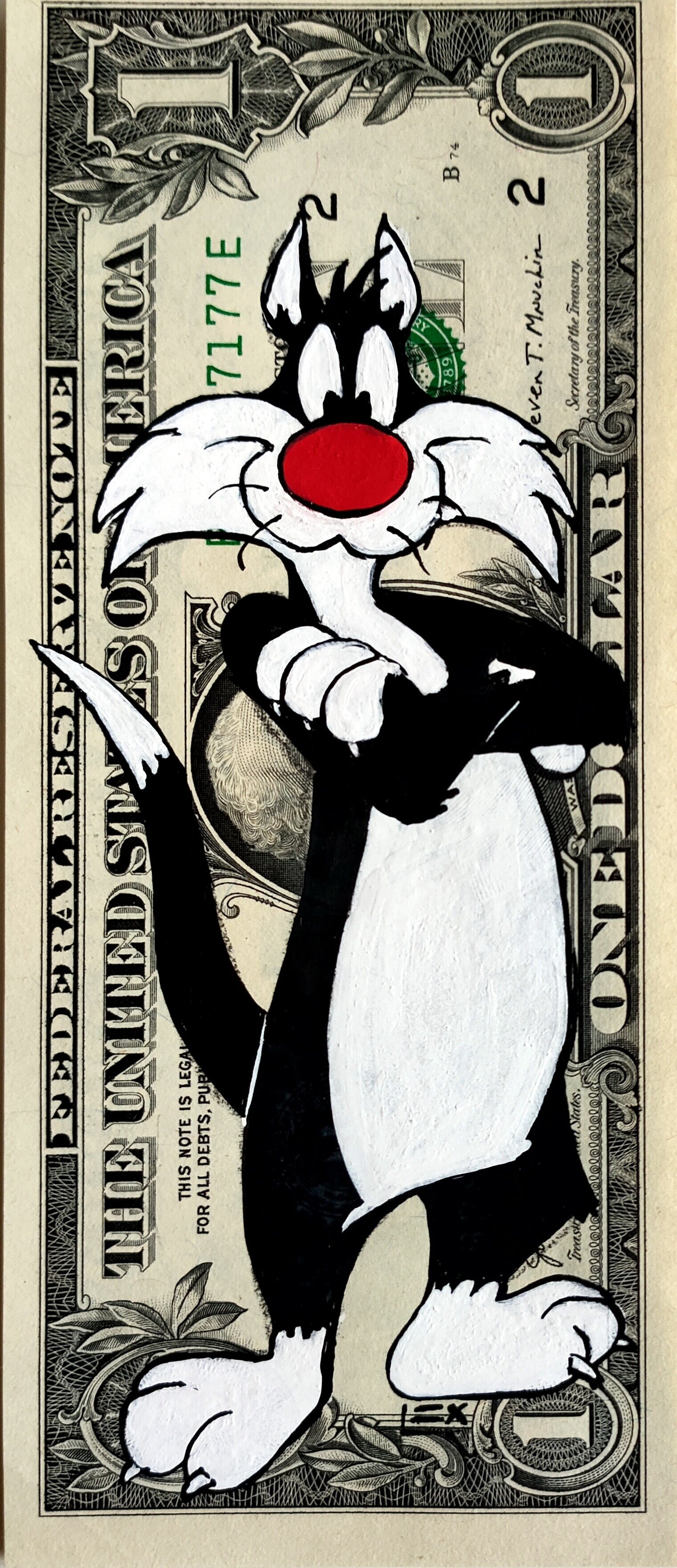 Kunst op een echt Dollar Biljet van kunstenaar Lex (1979). Sylvester the Cat "Ready" Dollar Art (2025).