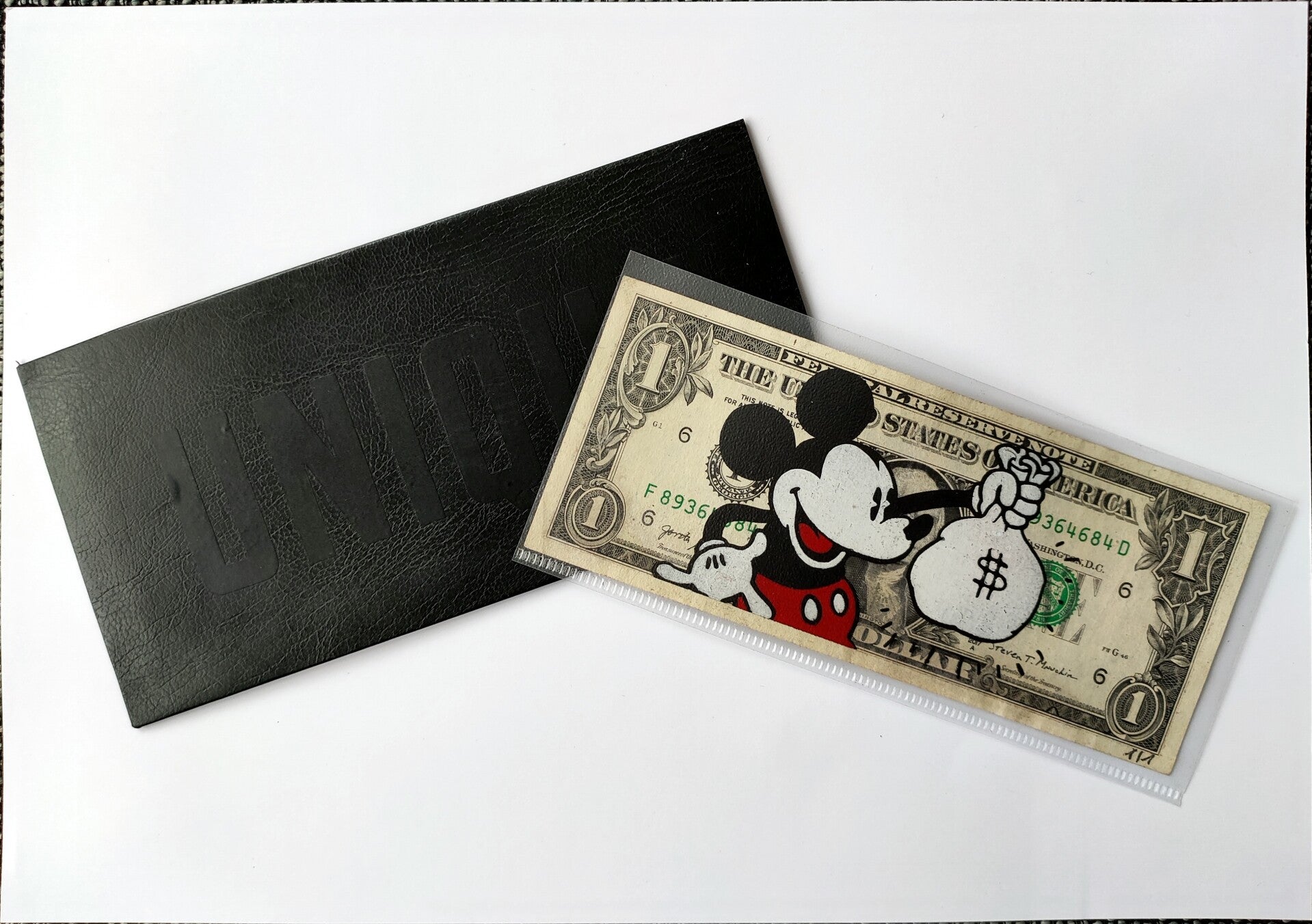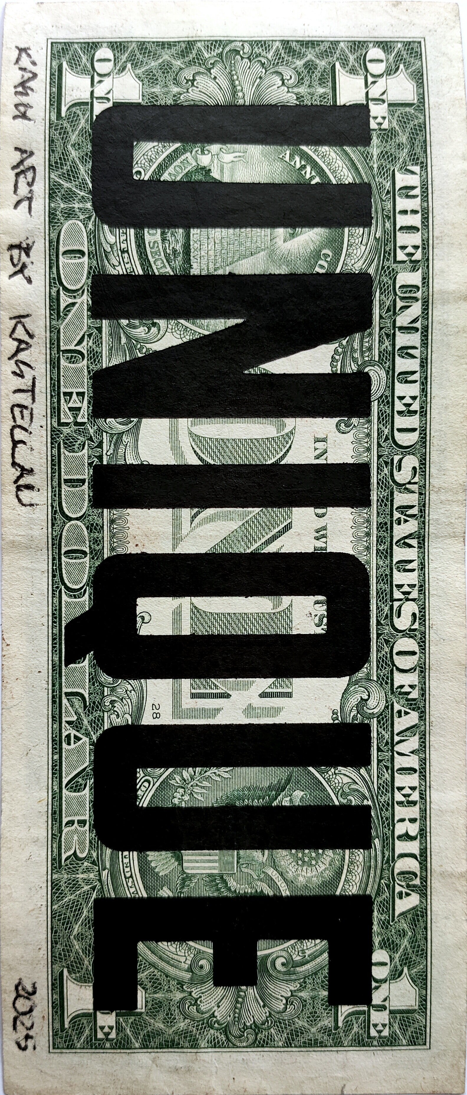 Kash Art by Kastellan. Dollar Art. Handwerk op een echt dollar biljet (6,6 cm x 15,6 cm). Gedateerd en handgesigneerd op de achterkant door de kunstenaar. Een uniek werk (1/1)! Inclusief een door de kunstenaar gemaakte envelop. Techniek: sjabloon en spuitbus.