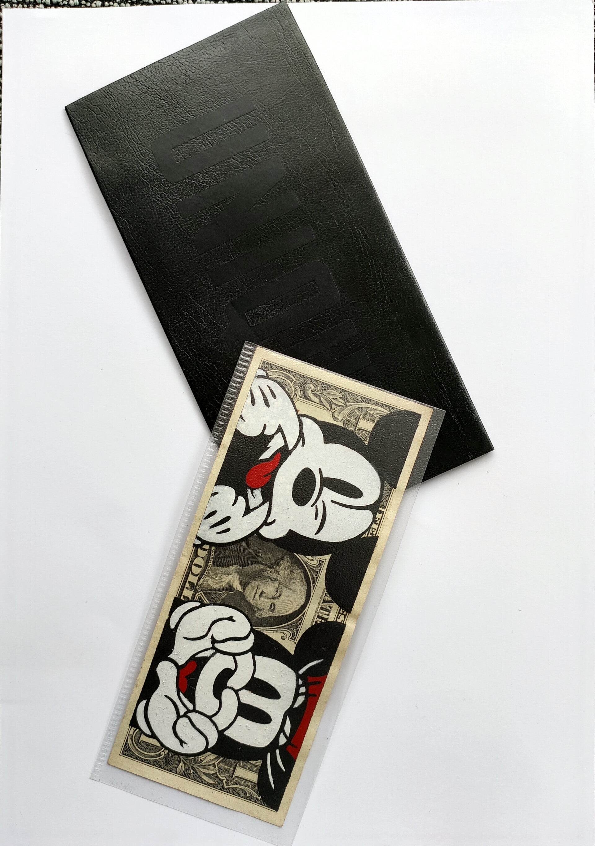 Kash Art by Kastellan. Dollar Art. Handwerk op een echt dollar biljet (6,6 cm x 15,6 cm). Gedateerd en handgesigneerd op de achterkant door de kunstenaar. Een uniek werk (1/1)! Inclusief een door de kunstenaar gemaakte envelop. Techniek: sjabloon en spuitbus.