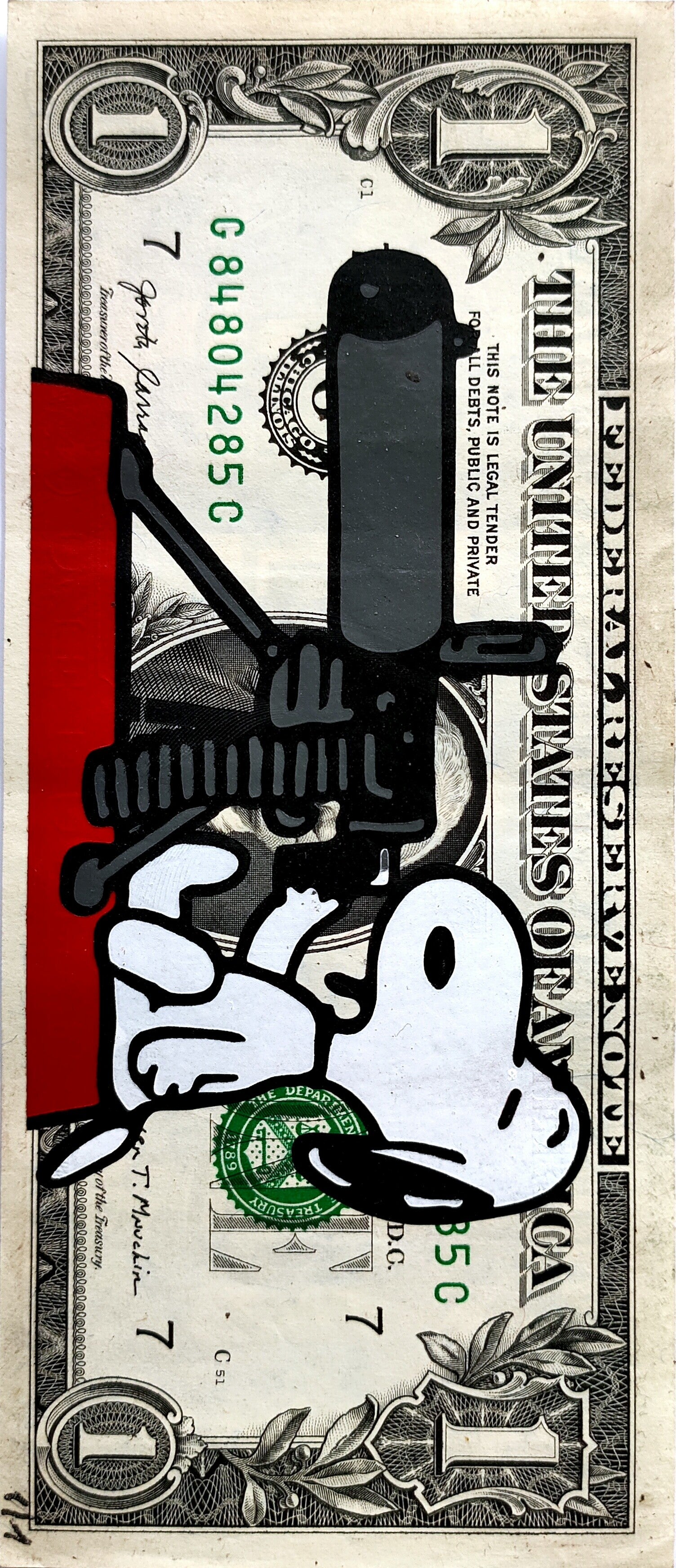Kash Art by Kastellan. Dollar Art. Handwerk op een echt dollar biljet (6,6 cm x 15,6 cm). Gedateerd en handgesigneerd op de achterkant door de kunstenaar. Een uniek werk (1/1)! Inclusief een door de kunstenaar gemaakte envelop. Techniek: sjabloon en spuitbus.