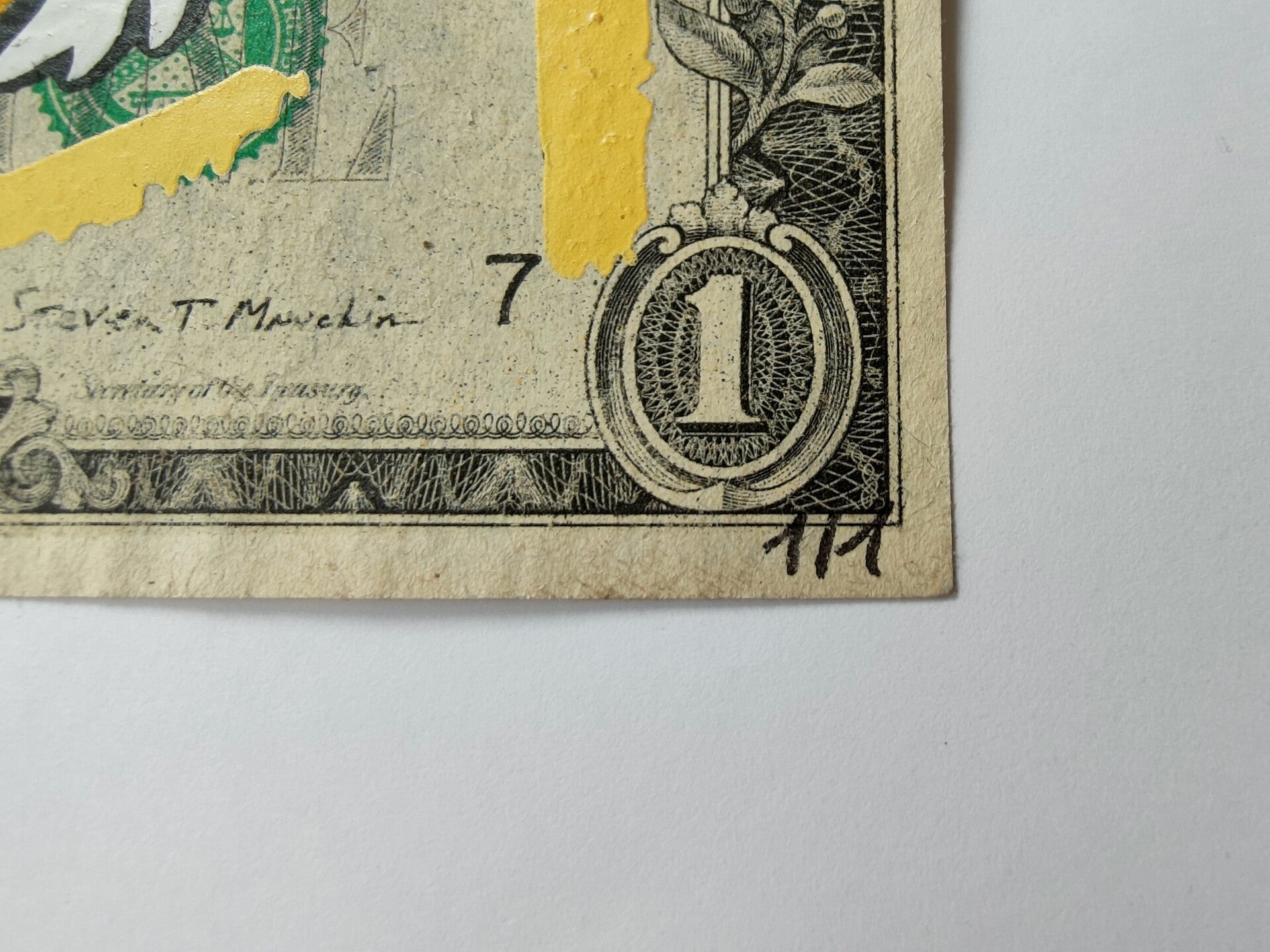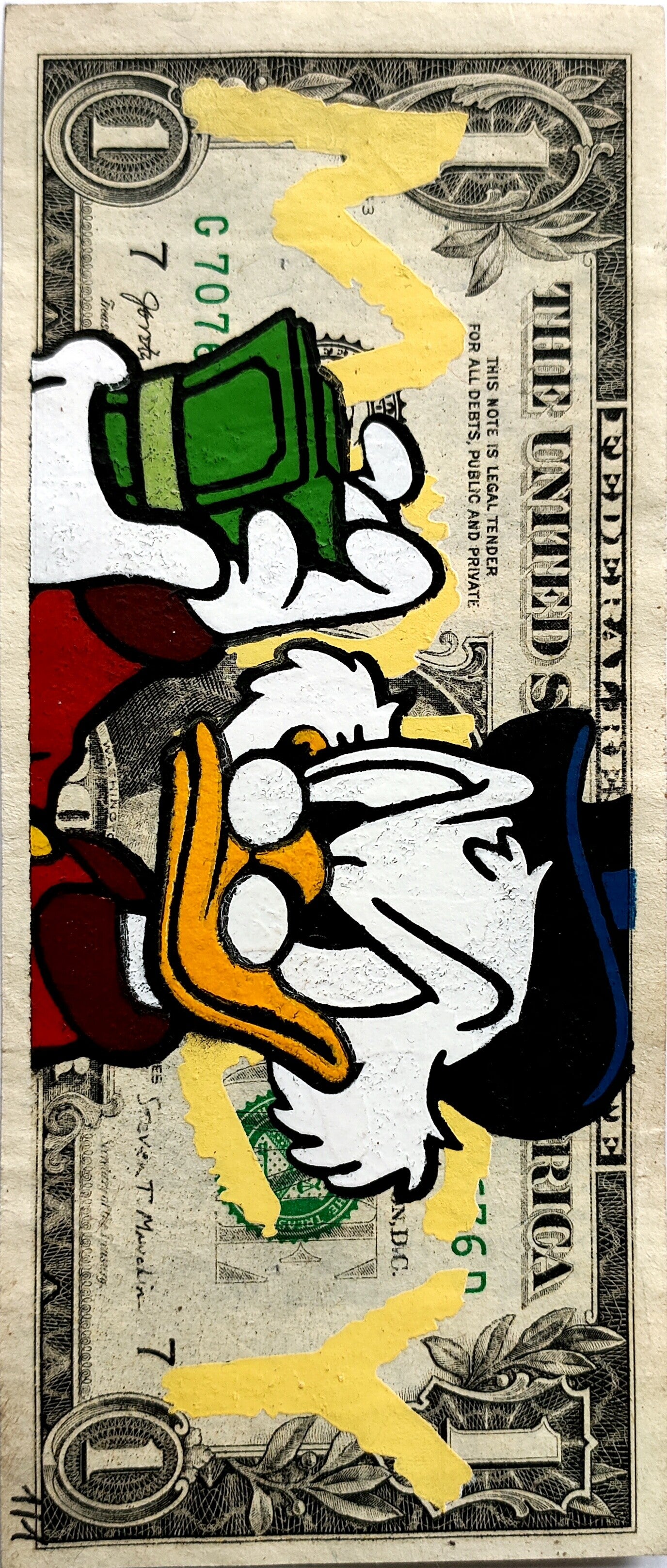 Kash Art by Kastellan. Dollar Art. Handwerk op een echt dollar biljet (6,6 cm x 15,6 cm). Gedateerd en handgesigneerd op de achterkant door de kunstenaar. Een uniek werk (1/1)! Inclusief een door de kunstenaar gemaakte envelop. Techniek: sjabloon en spuitbus.