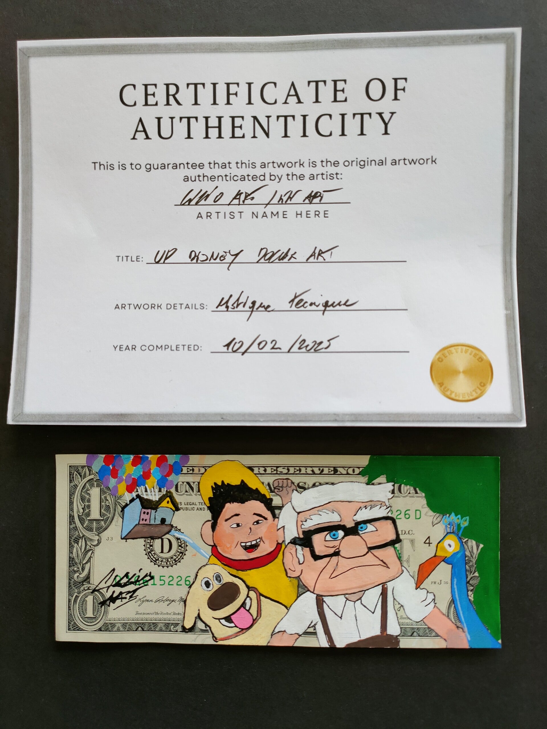 Dollar Art van Ciccio Art/KK Art (2002). Dit unieke kunstwerk met de titel Up Disney (2025) is gemaakt op een echt Dollar biljet.