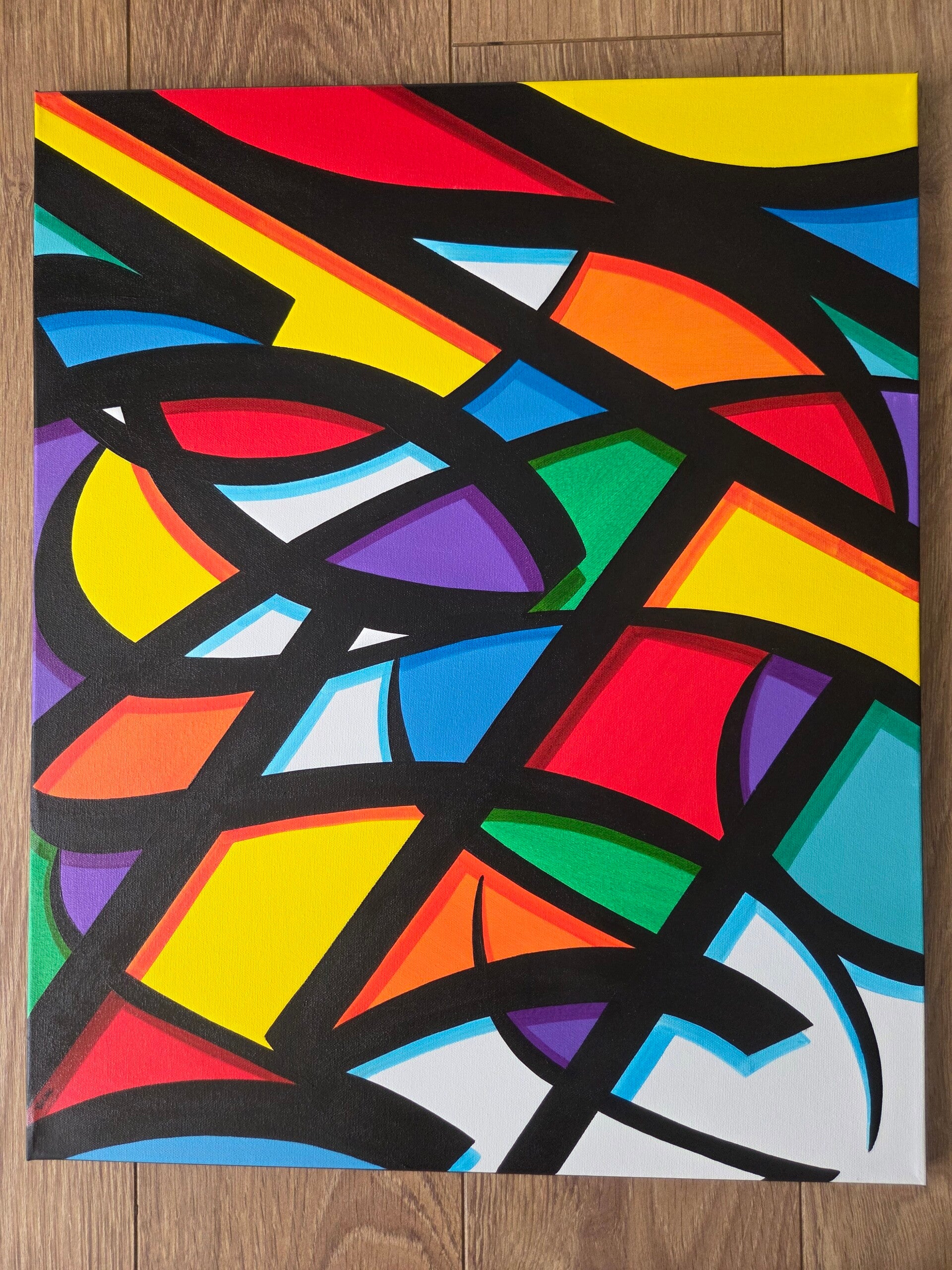 Technique: Mixed media Signature: Hand signed. This canvas stands out for its vibrant colors that evoke the four seasons, with warm hues and subtle gradients. The modernity of the work is reflected in the intense black lines that outline the composition, creating a unique and harmonious blend. Perfectly suited for any type of interior decor, it easily integrates into a living room or a small room, bringing a touch of life and energy to your space. The canvas can be hung vertically or horizontally, with or without a frame, as its edges are also colored, thus offering aesthetic versatility. Made on a cotton canvas, the work is painted with heavy body acrylic and spray paint, then protected by a layer of varnish for a durable finish.