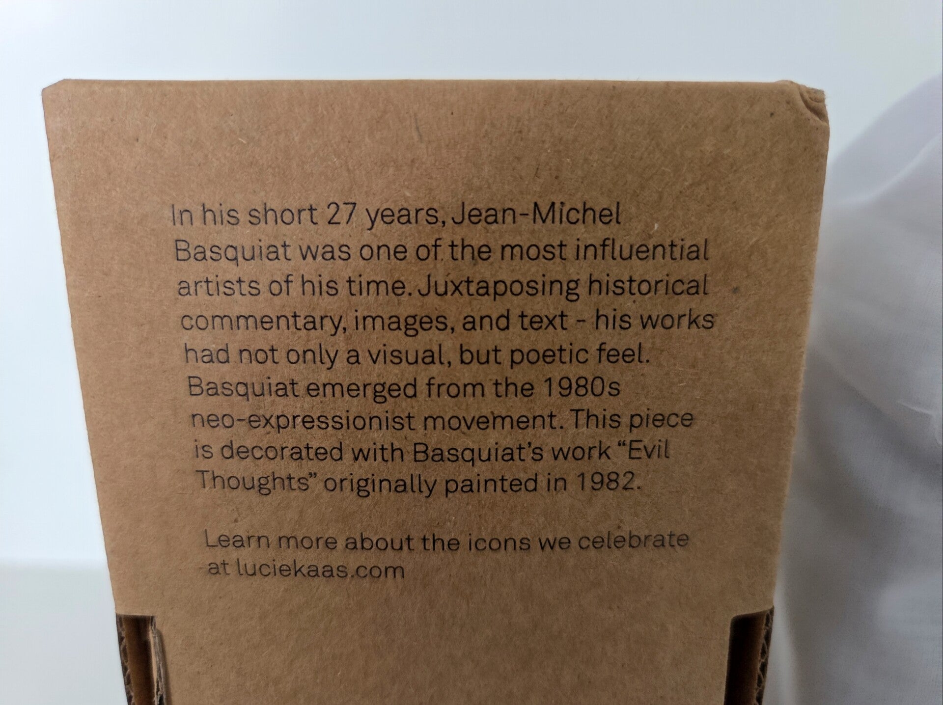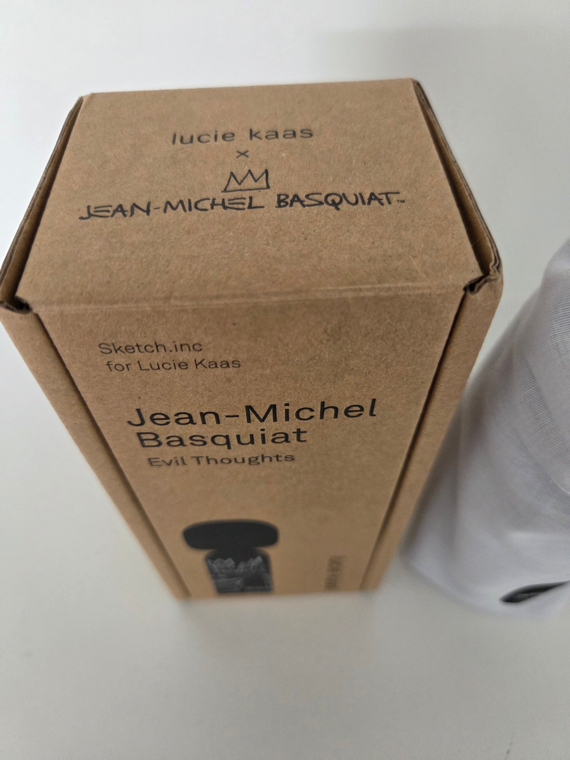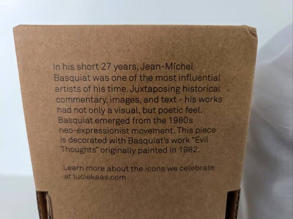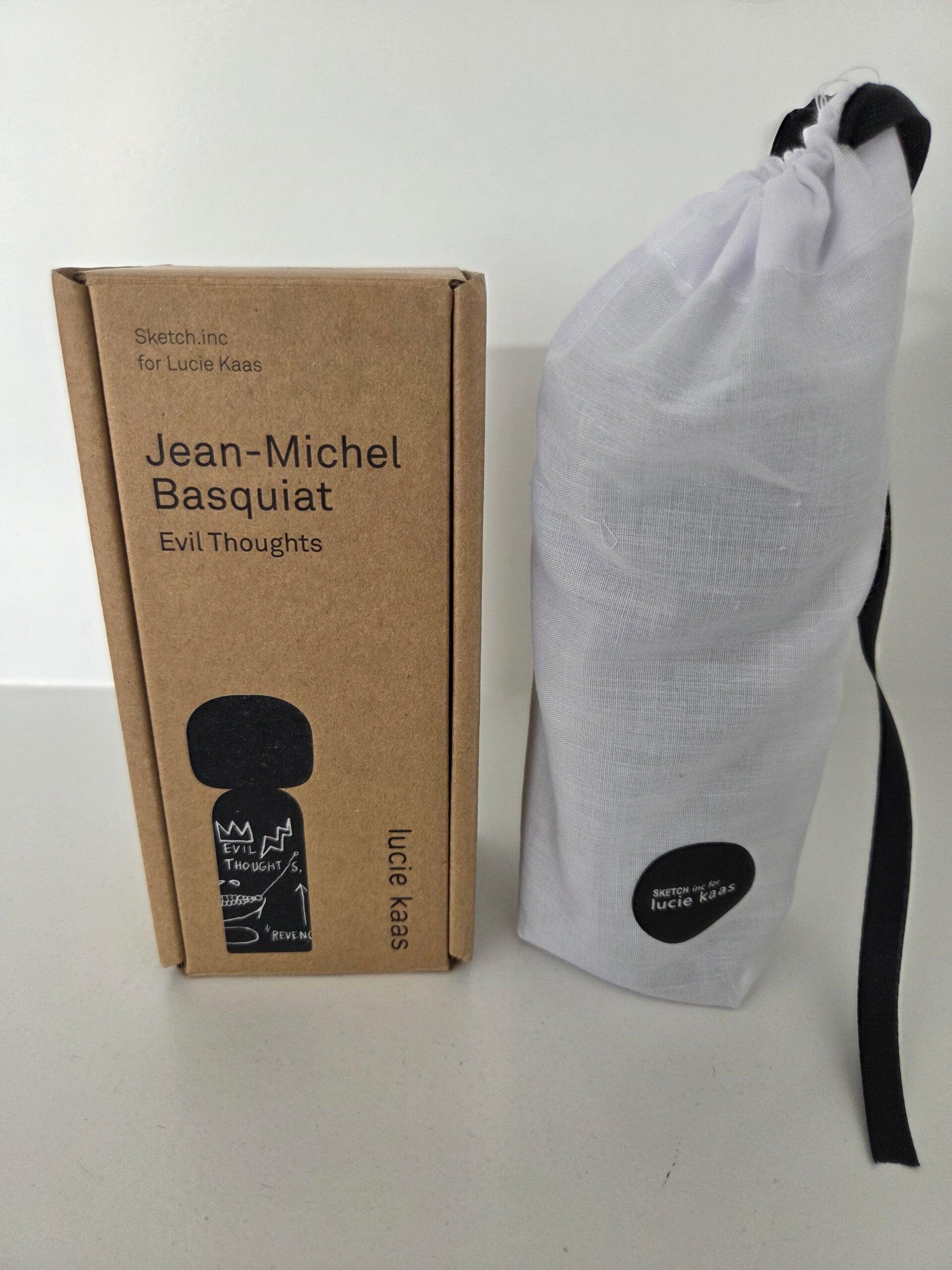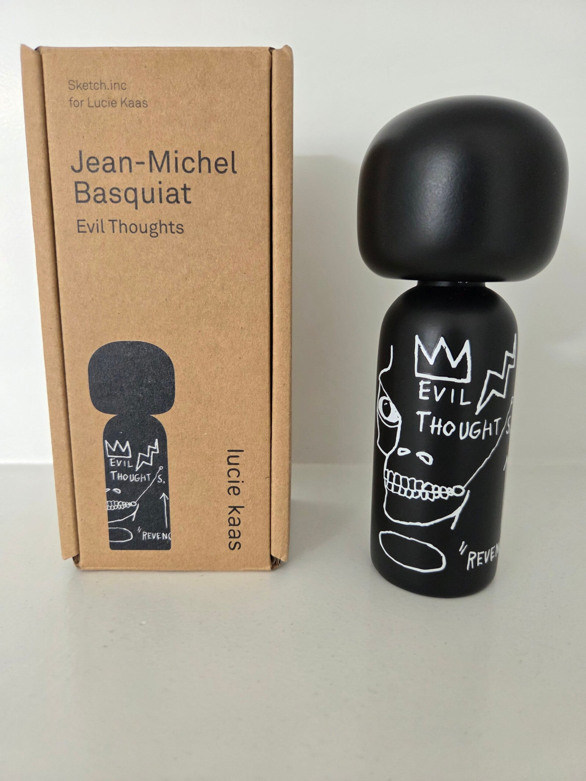 Jean-Michel Basquiat - Evil Thoughts Kokeshi Doll van Lucie Kaas. Kokeshi dolls zijn Japanse poppen die gekenmerkt worden door een groot hoofd en minimalistisch lichaam. Het is ontstaan als symbool voor vriendschap. De Kokeshi poppen van Lucie Kaas zijn tot stand gekomen in samenwerking met Becky Kemp (Sketch. Inc).
