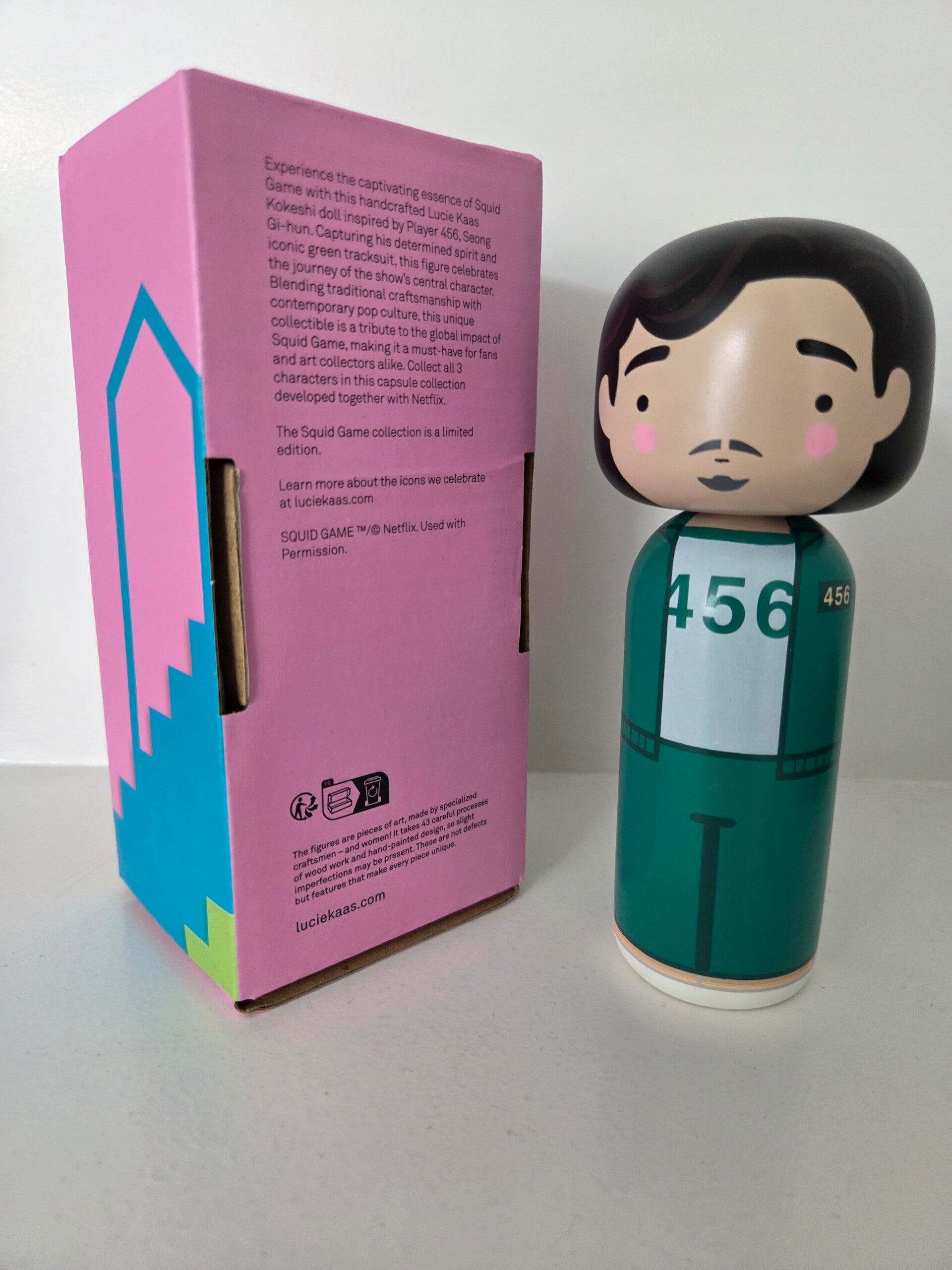 Lucie Kaas Kokeshi doll Player 456 (Squid Game). Limited edition. Hoogte: 14,5 cm. Materiaal: Beukenhout. Handbeschilderd. Designer: Becky Kemp.