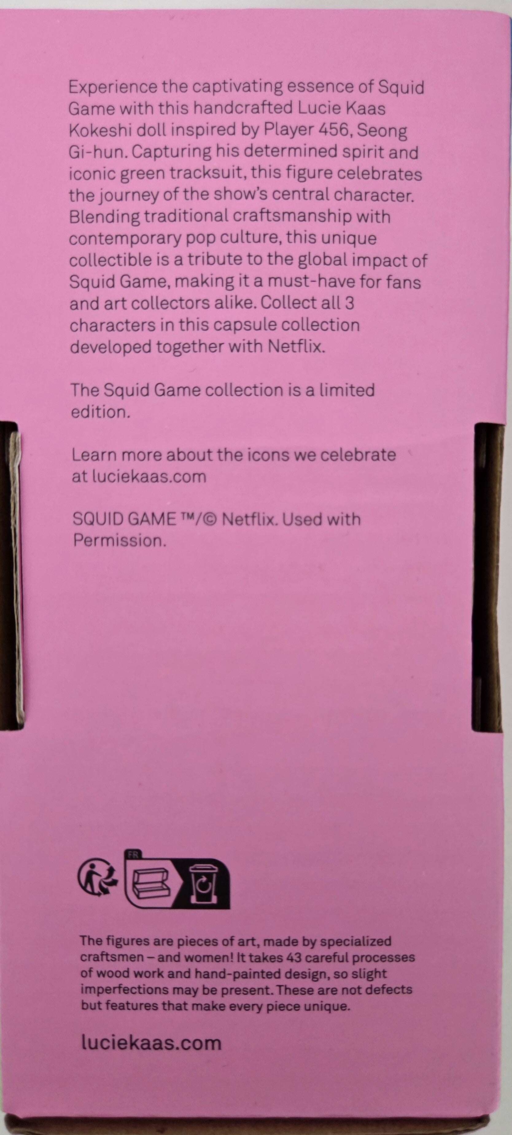 Een must-have voor alle Squid Game fans. Een limited edition serie van 3 personages uit de Netflix serie Squid Game. Dit is speler 456 Seong Gi-hun. Eén van de drie personages.
