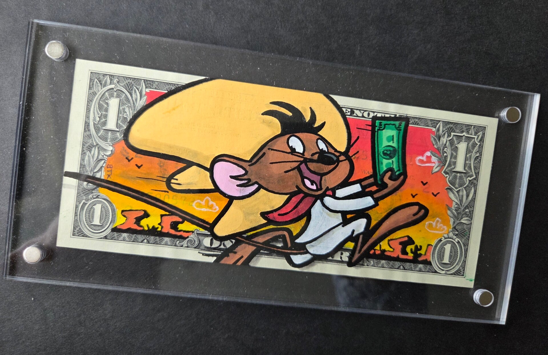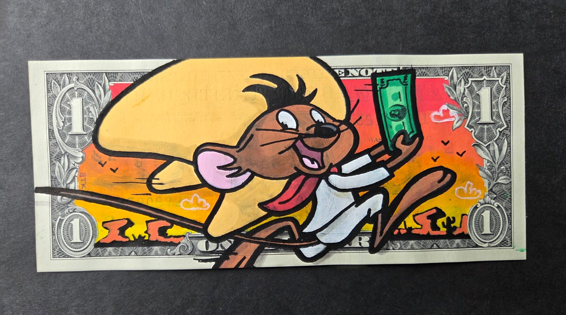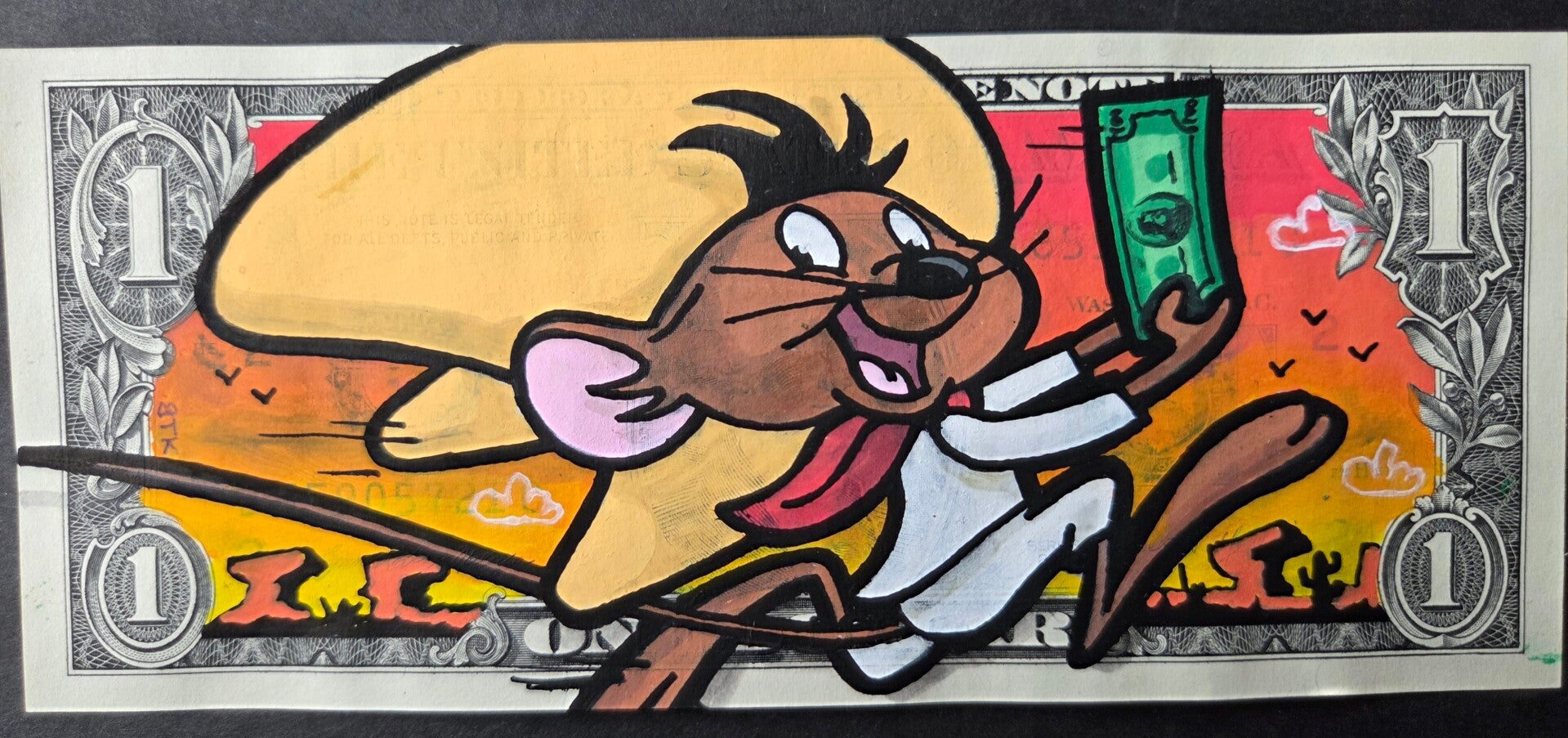 Dollar Art van Street Art kunstenaar Benny the Kid. Titel: "US Dóares". Afgebeeld is Speedy Gonzales. Acrylverf op een echt dollar biljet. Handgesigneerd en inclusief een gelimiteerde en genummerde oplage (3/3).