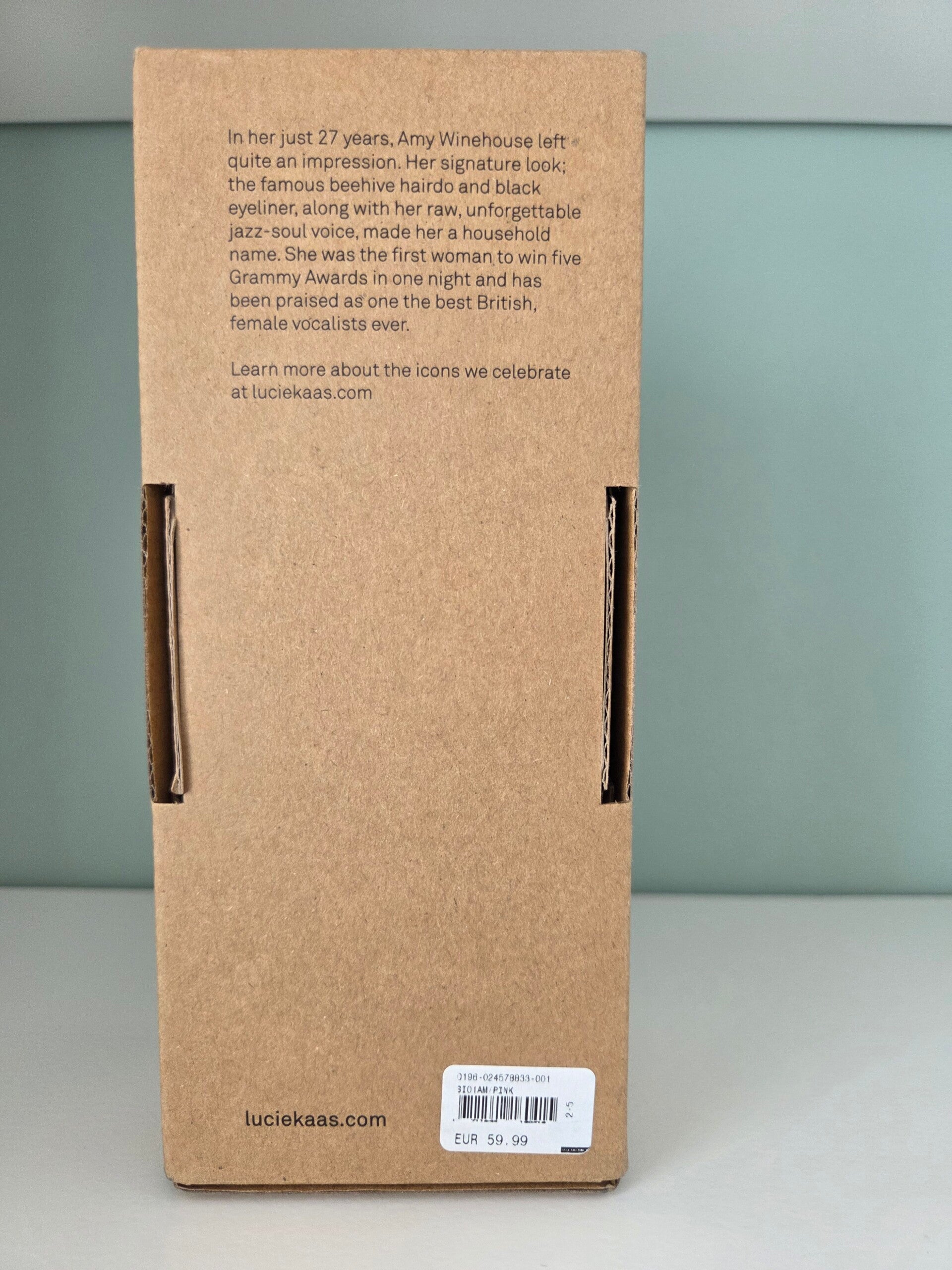 The handmade Kokeshi doll AMY by Lucie Kaas is a detailed tribute to the legendary singer Amy Winehouse. At 18 cm tall, this stylish wooden figure reflects Amy's striking look - from her famous beehive hairstyle to her iconic make-up. This exclusive Kokeshi doll is a must-have for collectors and fans who want to celebrate their love of Amy Winehouse and her music.