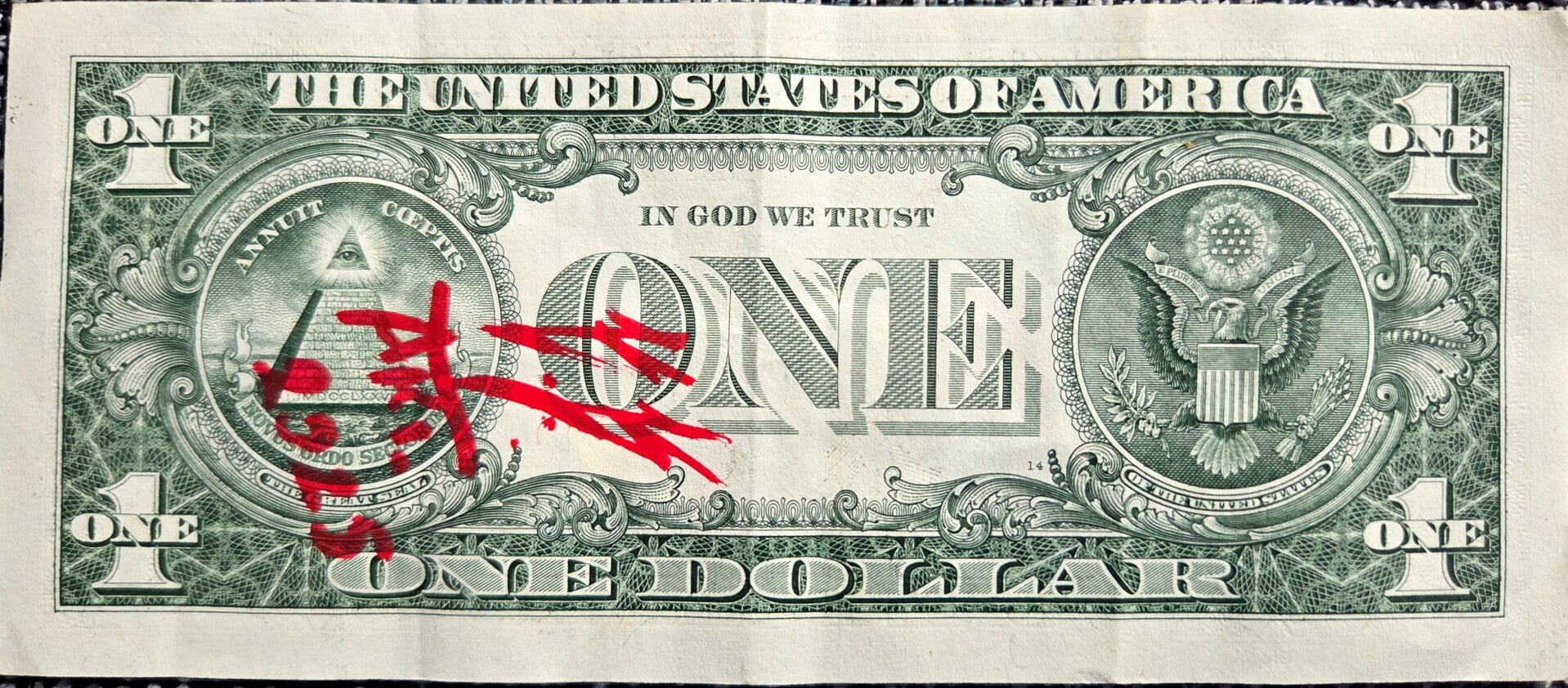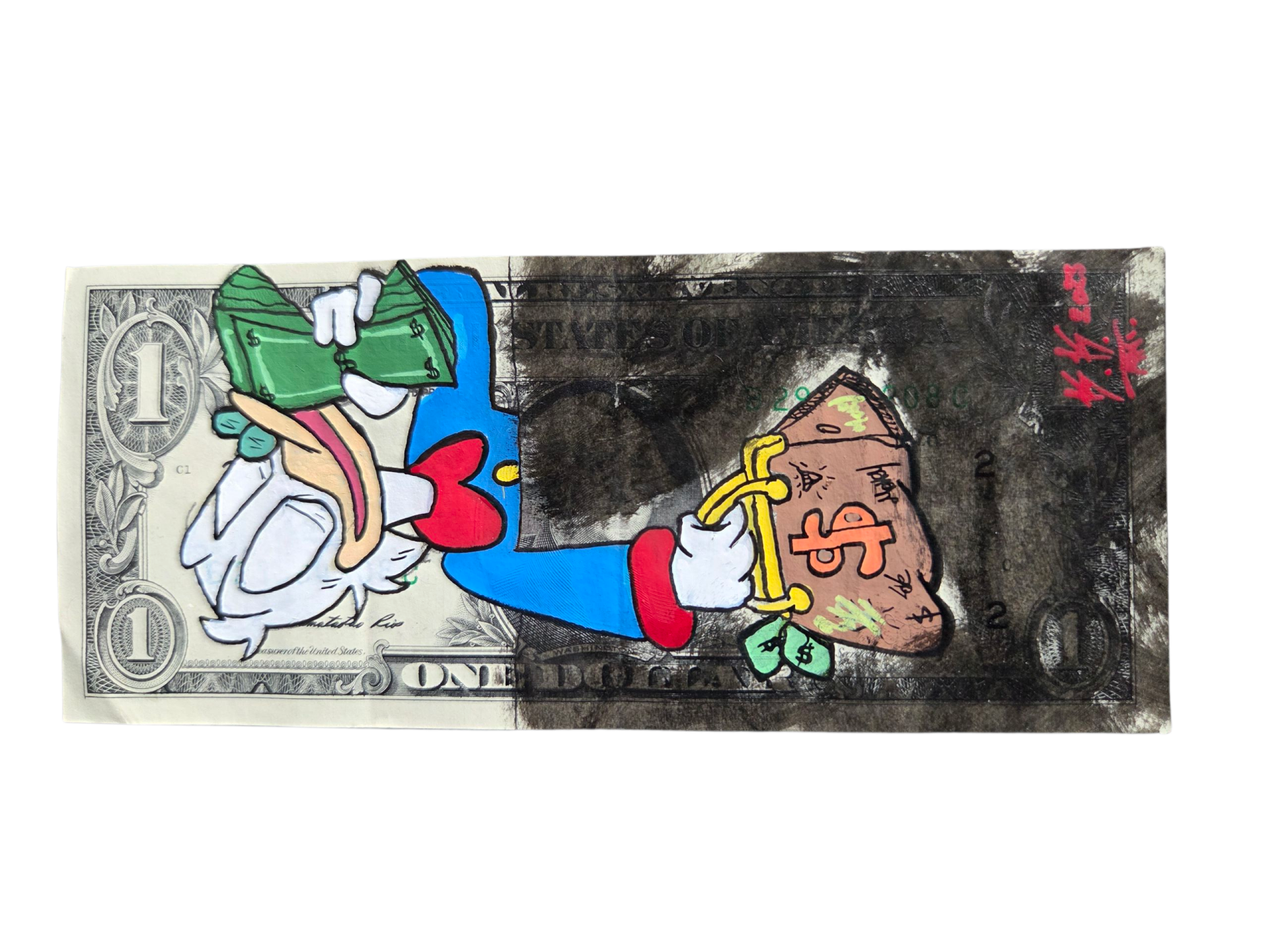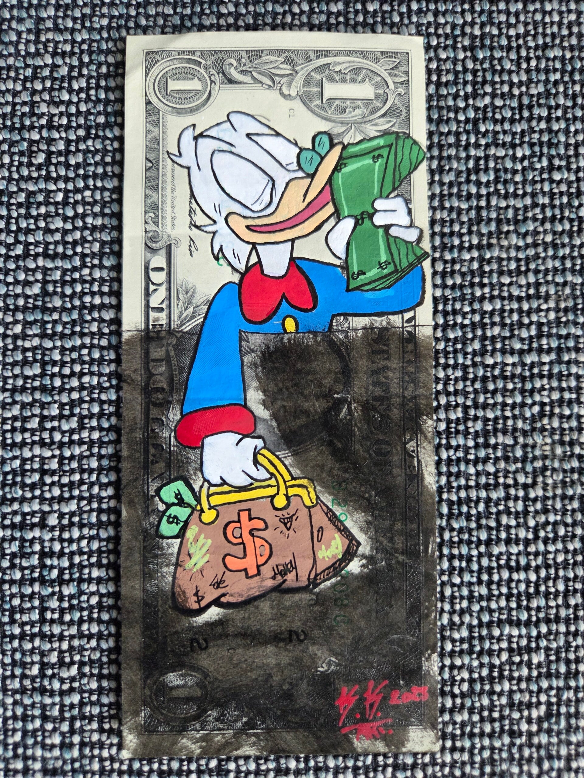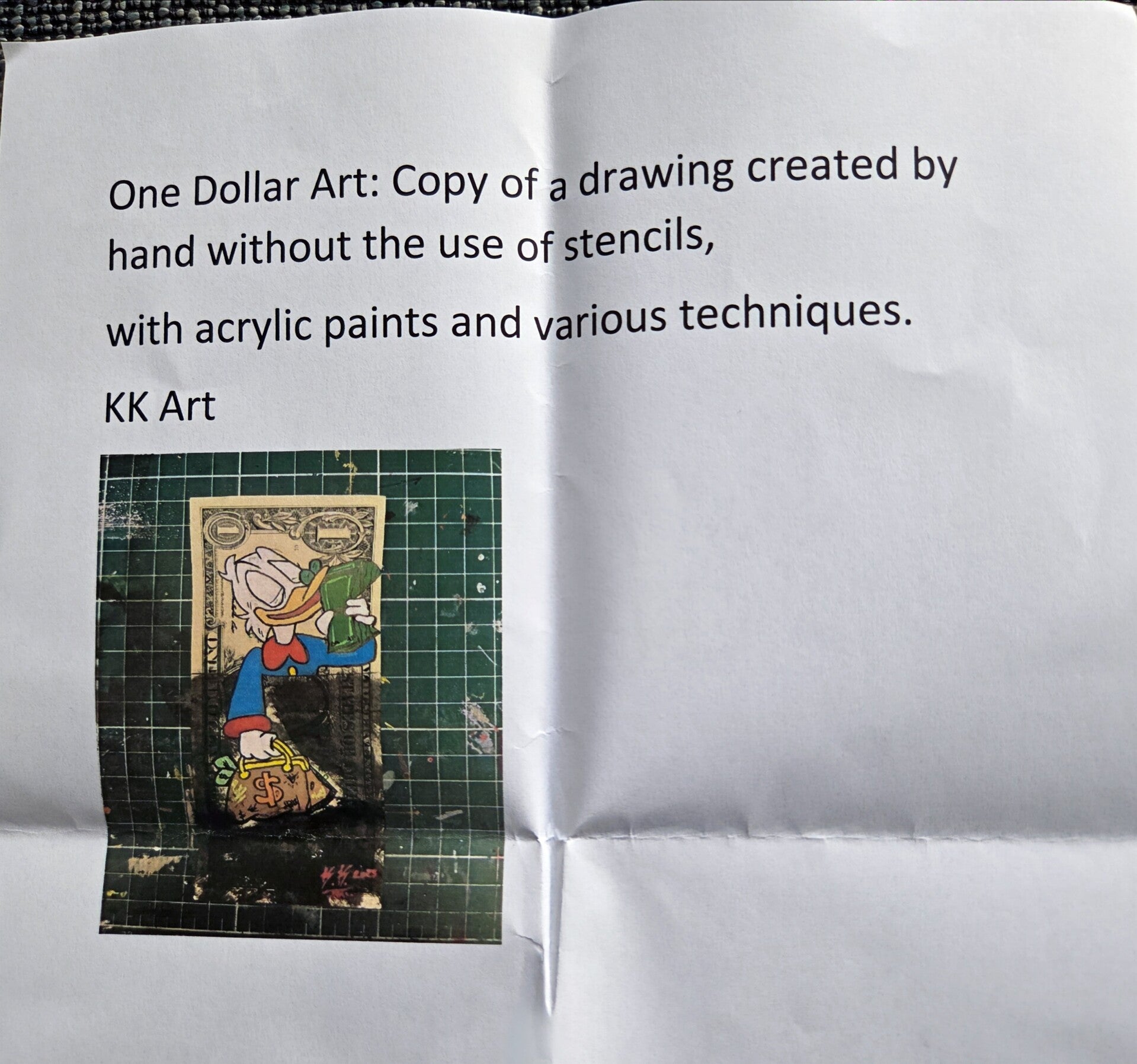 Dollar Art van Ciccio Art/KK Art (2002). Dit unieke kunstwerk met de titel Uncle Scrooge (2025) is gemaakt op een echt gelopen Dollar biljet.