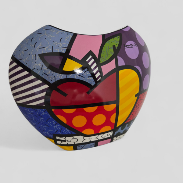 De "Big Apple" vaas is gemaakt van porselein en is gedecoreerd in de kenmerkende Pop Art stijl van Romero Britto, met levendige kleuren en patronen. Afmetingen L / B / H: 26.5 cm / 11.5 cm / 21 cm.