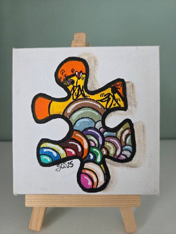 Originele handgeschilderde illustratie op een mini canvas (10x10cm), met houten ezeltje, van de Italiaanse kunstenaar SOS (@Save_Our_Souls).