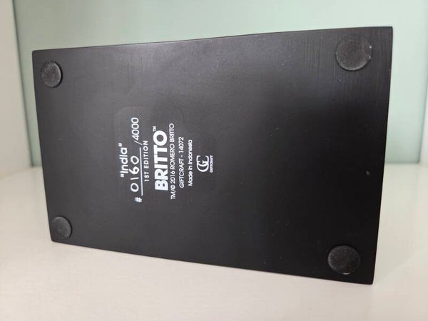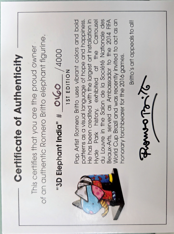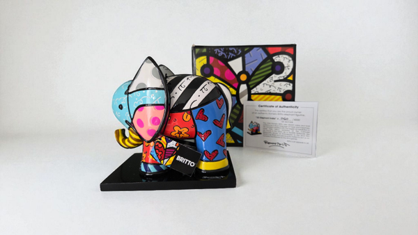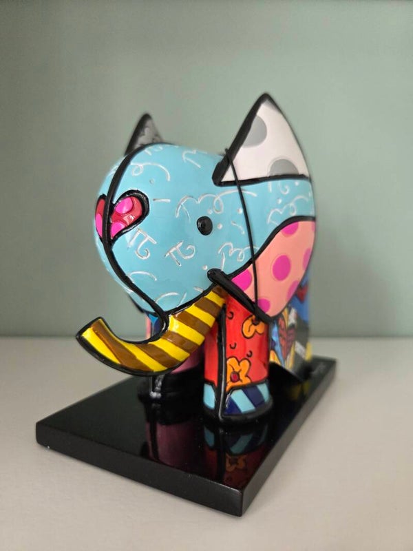 Romero Britto Limited Edition. Beeldje op voet met echtheidscertificaat. In geschenkverpakking. Het staande olifantontwerp toont het kenmerkende gebruik van levendige kleuren en gedurfde grafische vormgeving van de iconische popartiest. Gemaakt van polyresin.