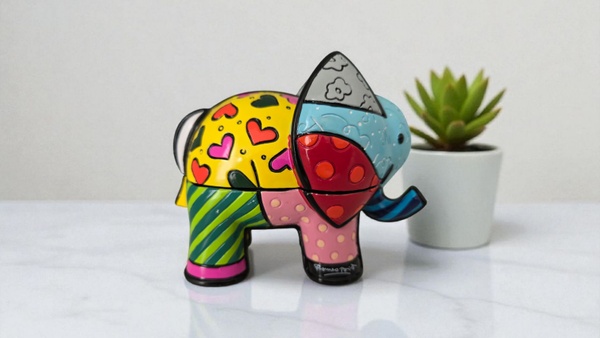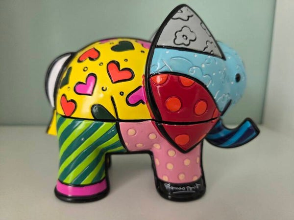 Romero Britto 3D Olifant Design Sieradendoosje. In geschenkverpakking. Met het kenmerkende gebruik van levendige kleuren en opvallend grafisch design van de iconische popartiest. Gemaakt van polyresin.
