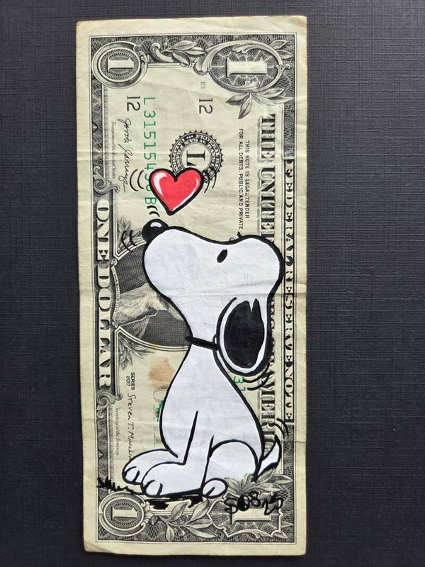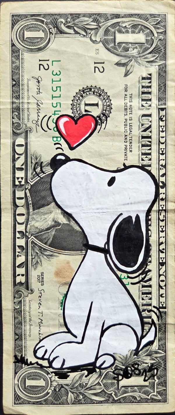 Dollar Art by SOS. Een originele handgeschilderde illustratie op een echt gelopen Dollar biljet, van de Italiaanse kunstenaar SOS (@Save_Our_Souls).