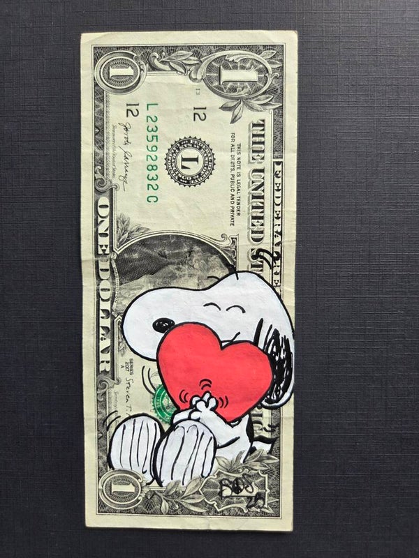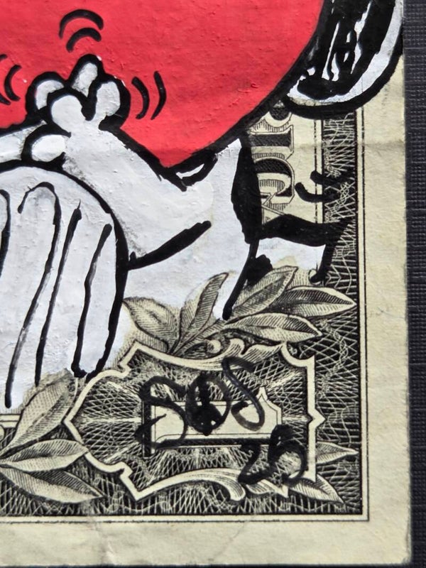 Dollar Art by SOS. Een originele handgeschilderde illustratie op een echt gelopen Dollar biljet, van de Italiaanse kunstenaar SOS (@Save_Our_Souls).
