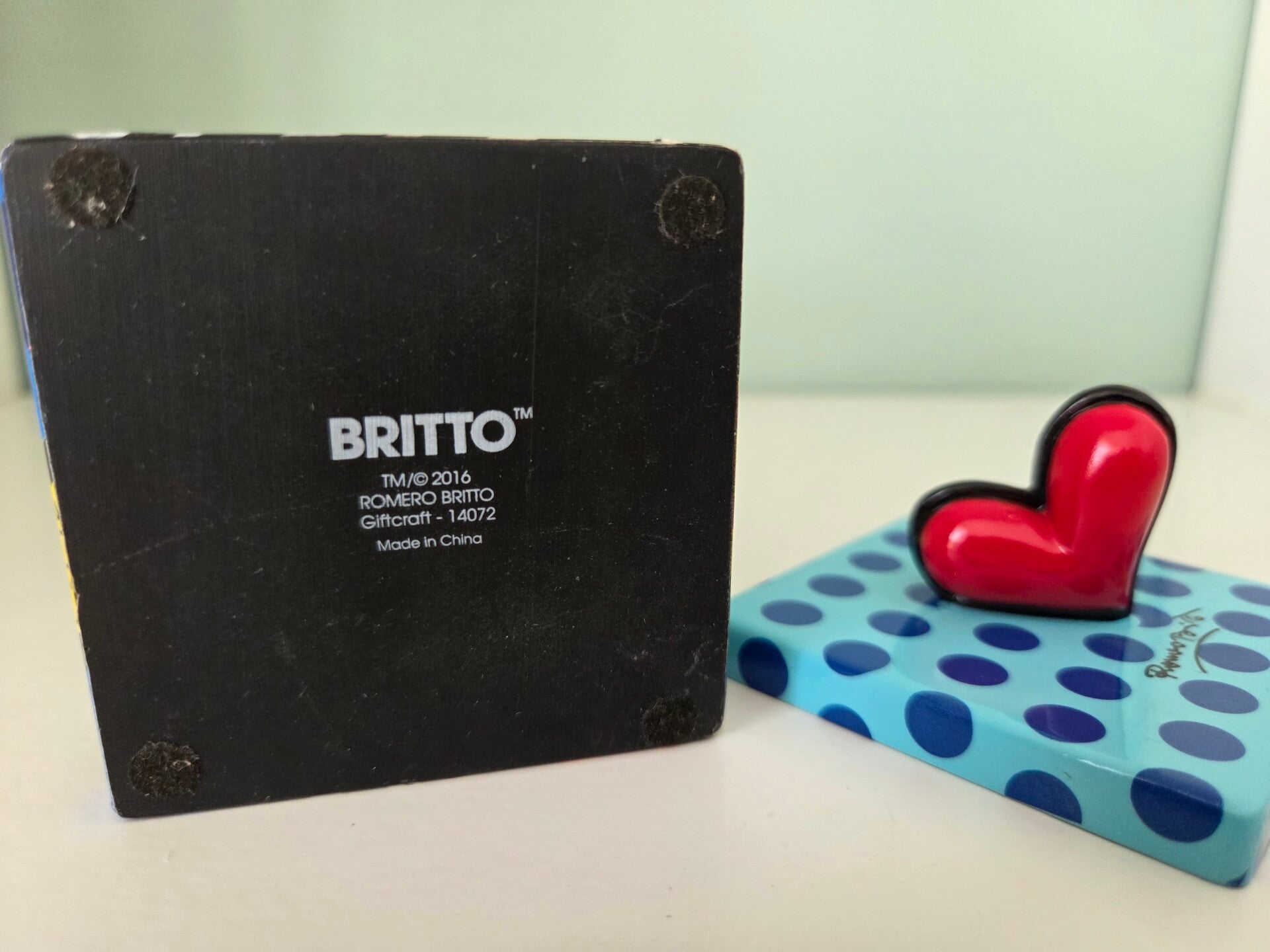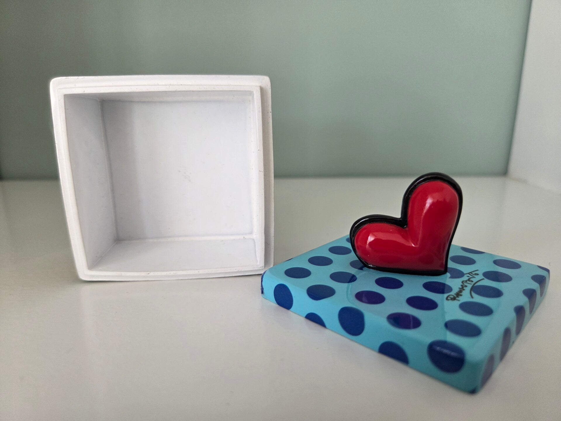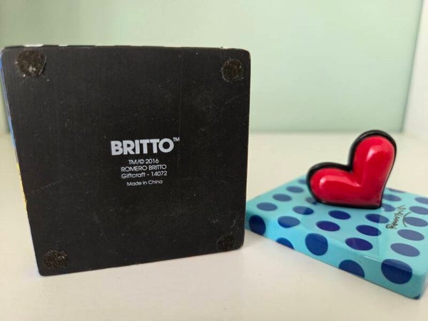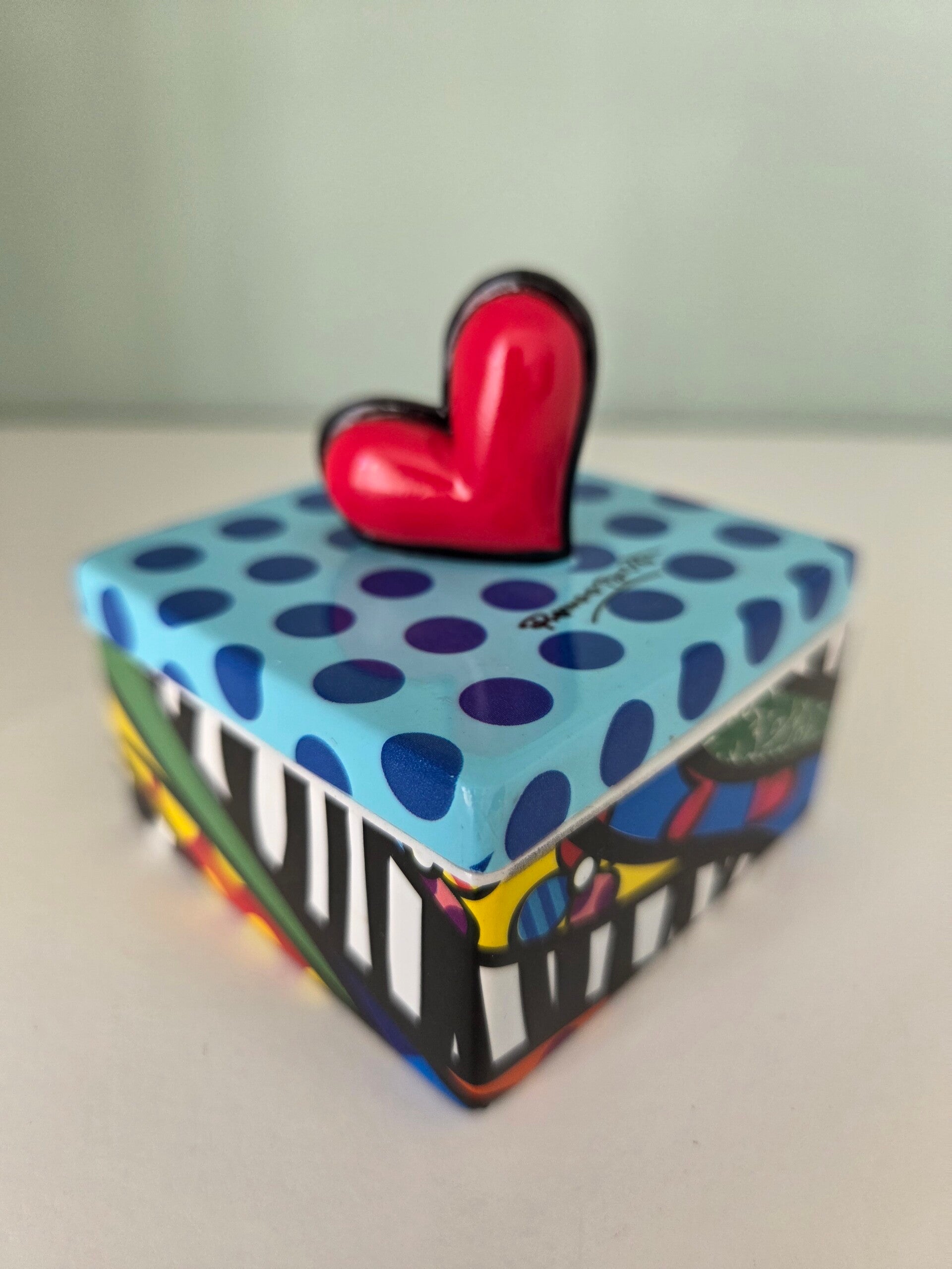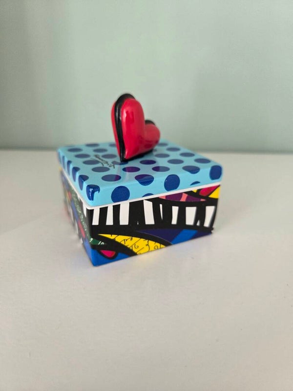 Sieraden- of snuisterijendoosje van Romero Britto met grafisch patroon en een hartje op de doos. Afmetingen: 6x6x6 cm. Materiaal: kunsthars. Handbeschilderd.