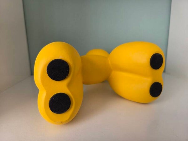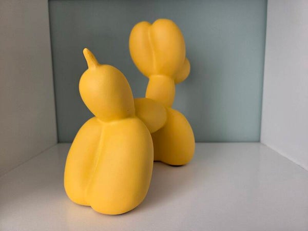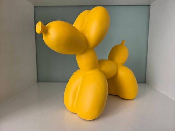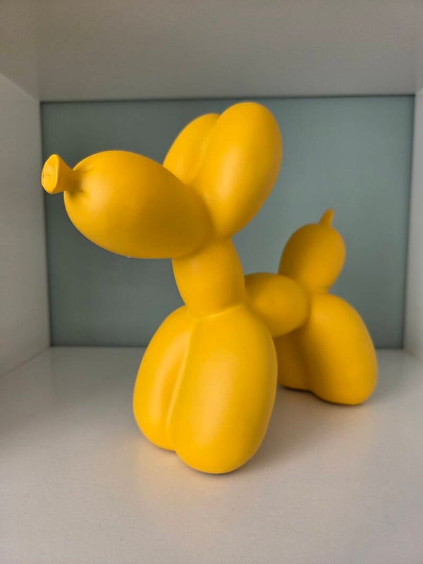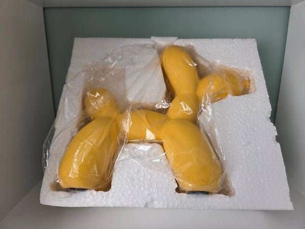 Balloon Dog kleur geel. Afmetingen: 18 cm hoog en 22 cm breed. Inclusief originele piepschuim verpakking in doos.