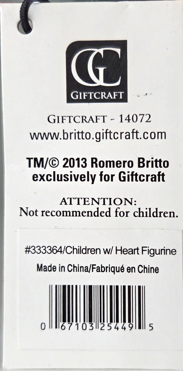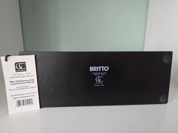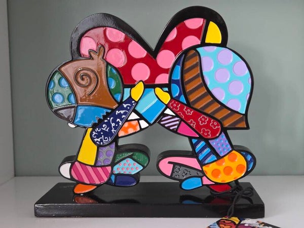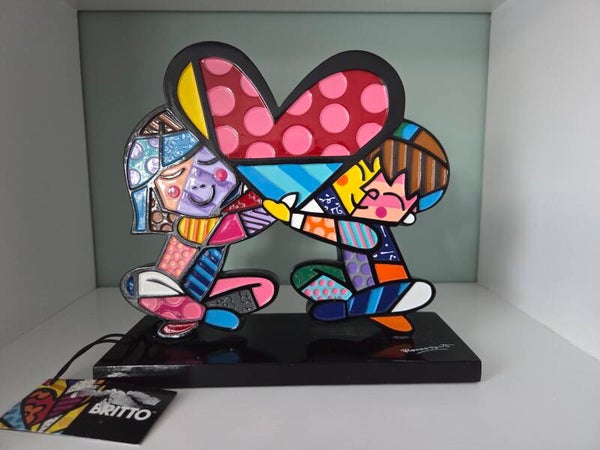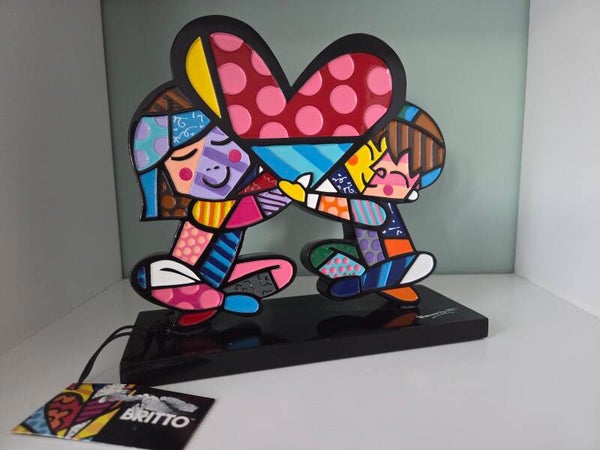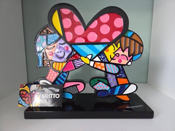 Romero Britto Polyresin Jongen en Meisje met Hart Beeldje. Dit beeldje toont het kenmerkende gebruik van levendige kleuren en gedurfde grafische vormgeving van de iconische popkunstenaar.