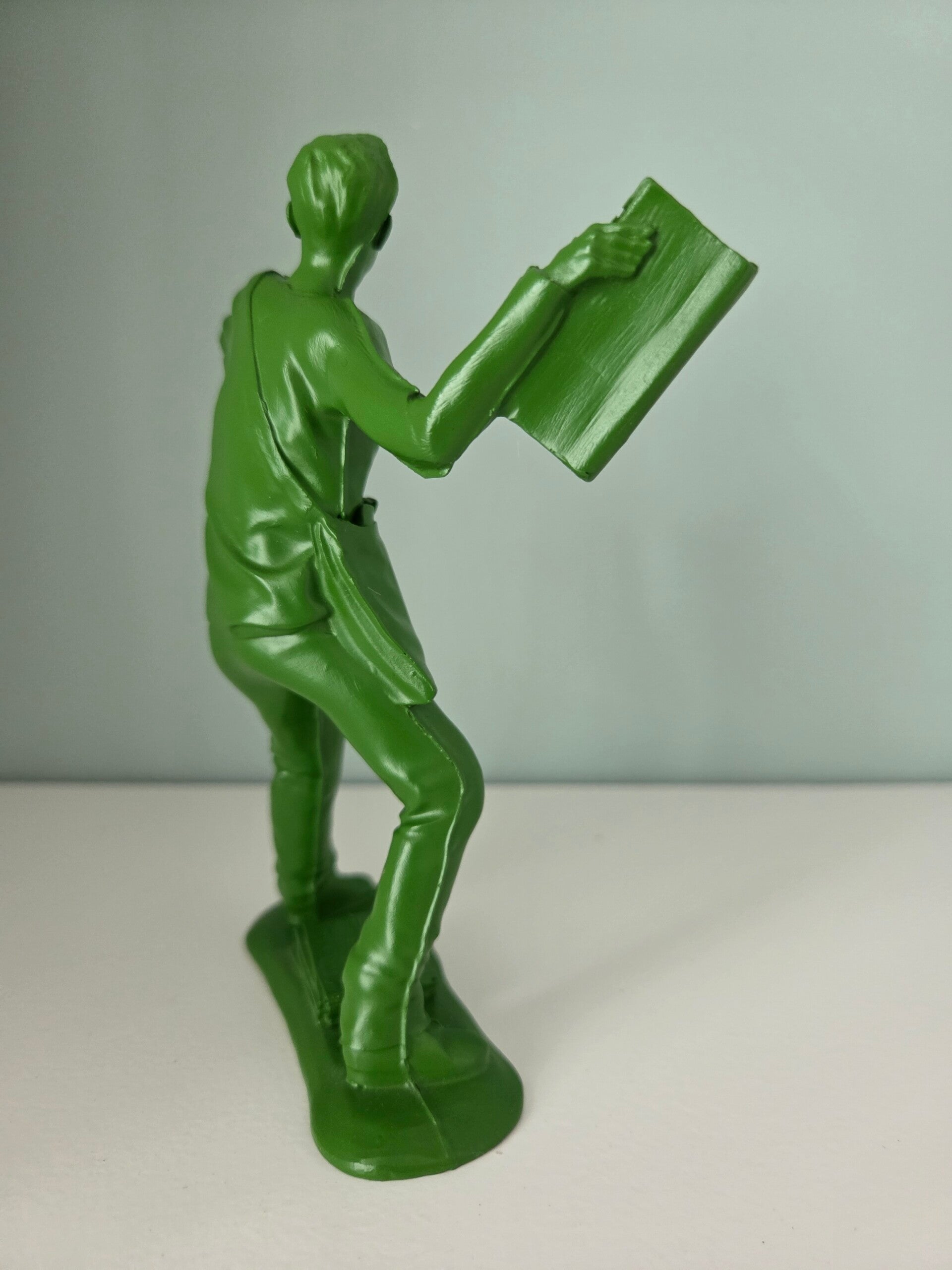 Het beeldje is een interpretatie van een speelgoedsoldaatje, maar dan in de houding van een predikant of spreker met een boek in de hand.