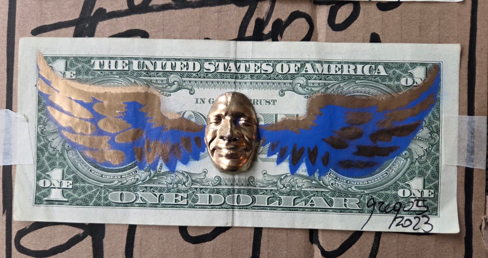 Gemengde techniek. Materiaal: hars, spuitverf op een echte dollarbiljet. Handbeschilderd en handgesigneerd, inclusief COA.
