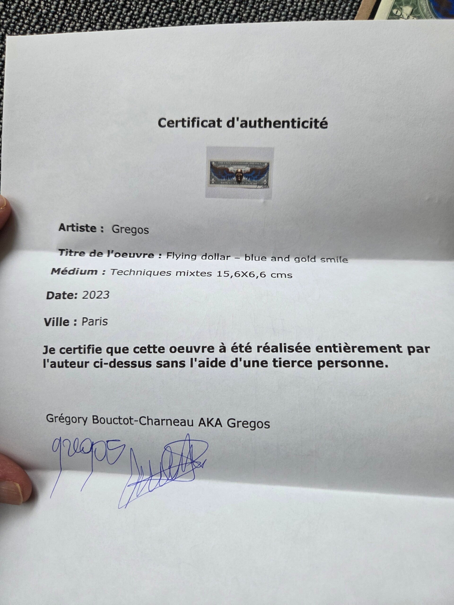 Gregos - Flying Dollar - blue and gold smile.