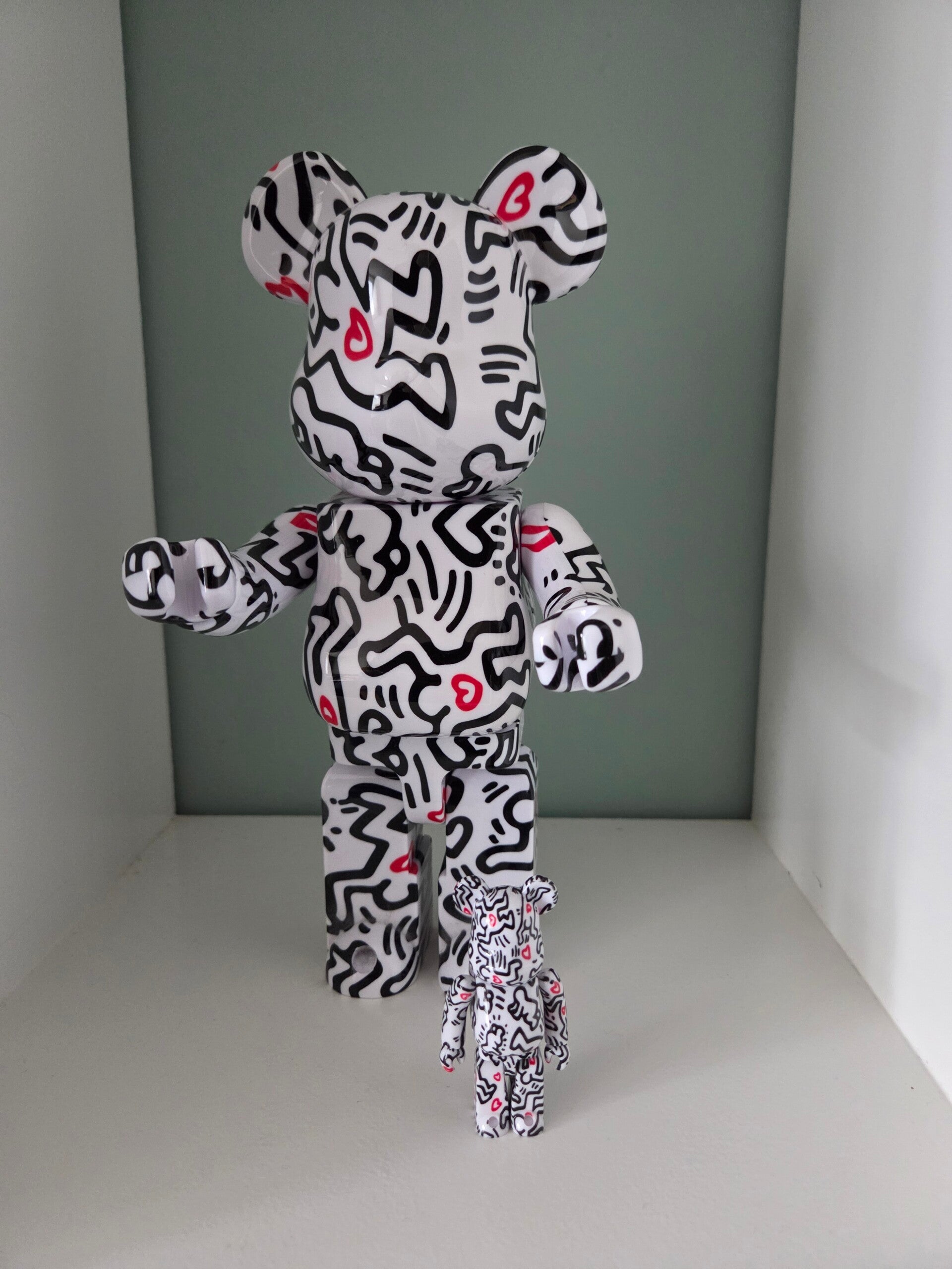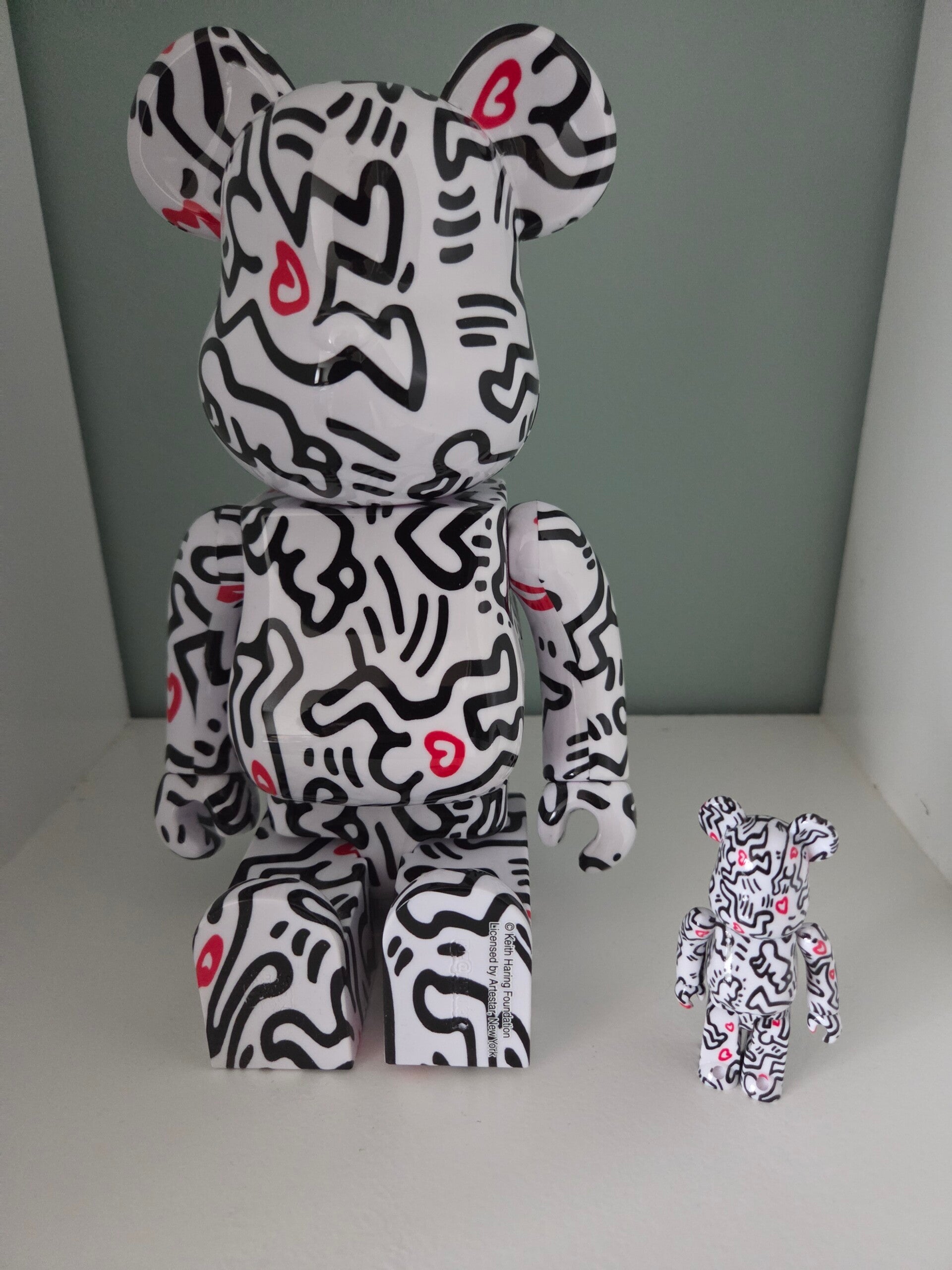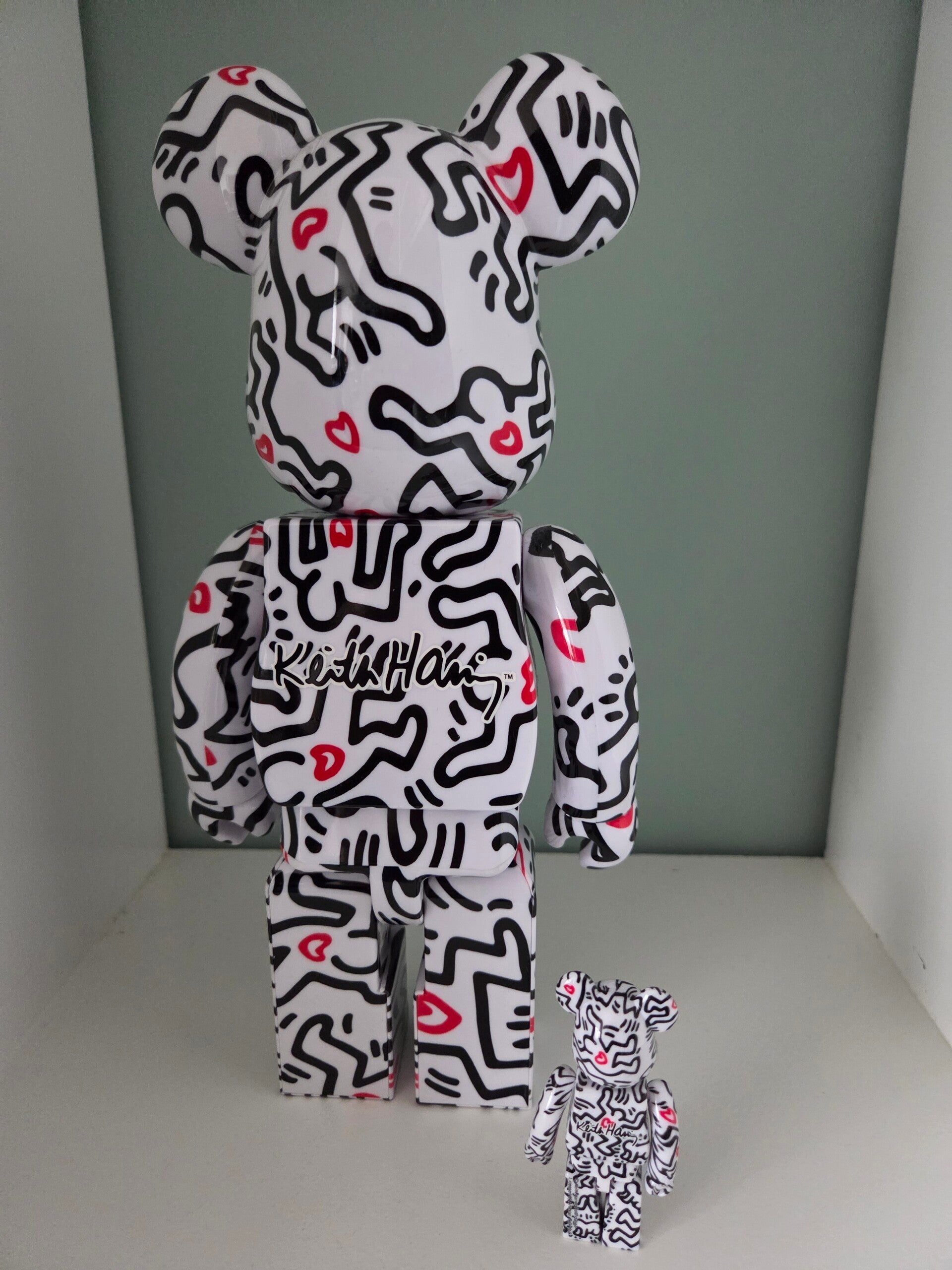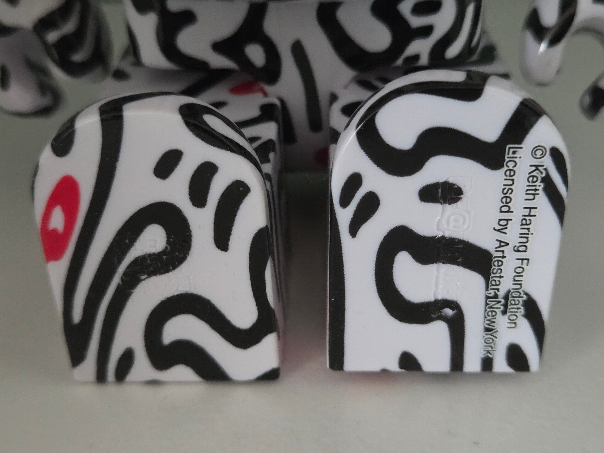 De Bearbrick-figuren hebben een witte basis met Keiths kenmerkende dansende karaktertekeningen in zwart met rode hartjes. De Bearbricks zijn beschilderd met een unieke hydrodipping-techniek, waardoor elk figuur een uniek ontwerp heeft.