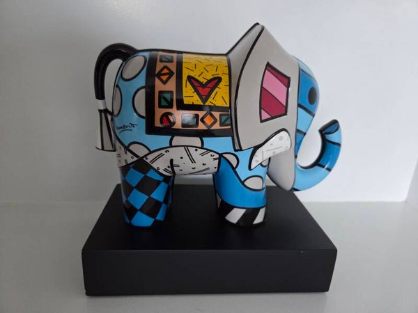 - Kenmerken: De olifant is gedecoreerd met Britto's iconische felle kleuren en gedurfde geometrische patronen.