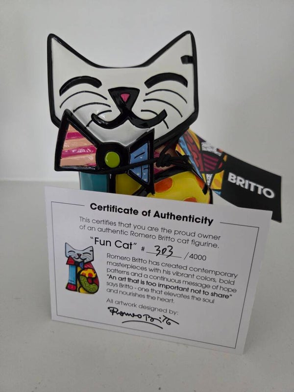 Romero Britto sculpture 'Fun Cat'. 2009. Inclusief bijbehorende tag en certificaat van echtheid. Met de originele geschenkverpakking. Hoogte beeldje: 14 cm.