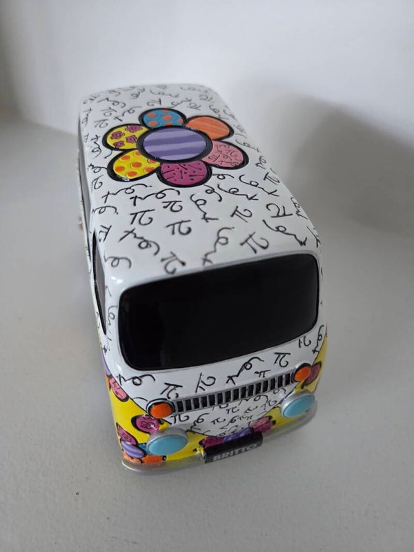 Dit object is een Volkswagen Wagon Van beeldje ontworpen door de bekende popartkunstenaar Romero Britto.