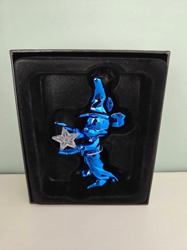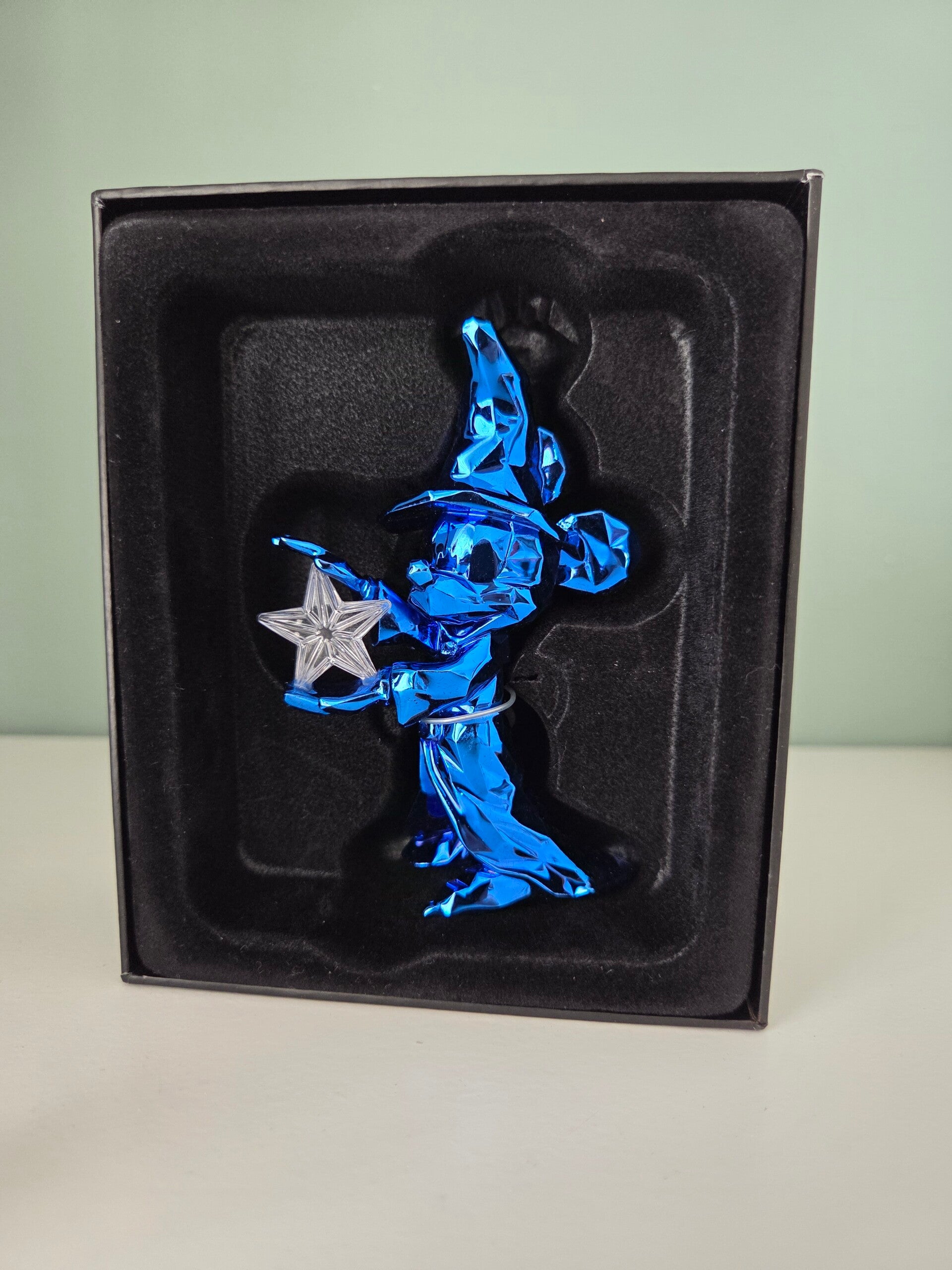 Materiaal: Blauw metaal of hars (resin) met een glanzende afwerking. Details: Mickey houdt een doorzichtige ster vast.