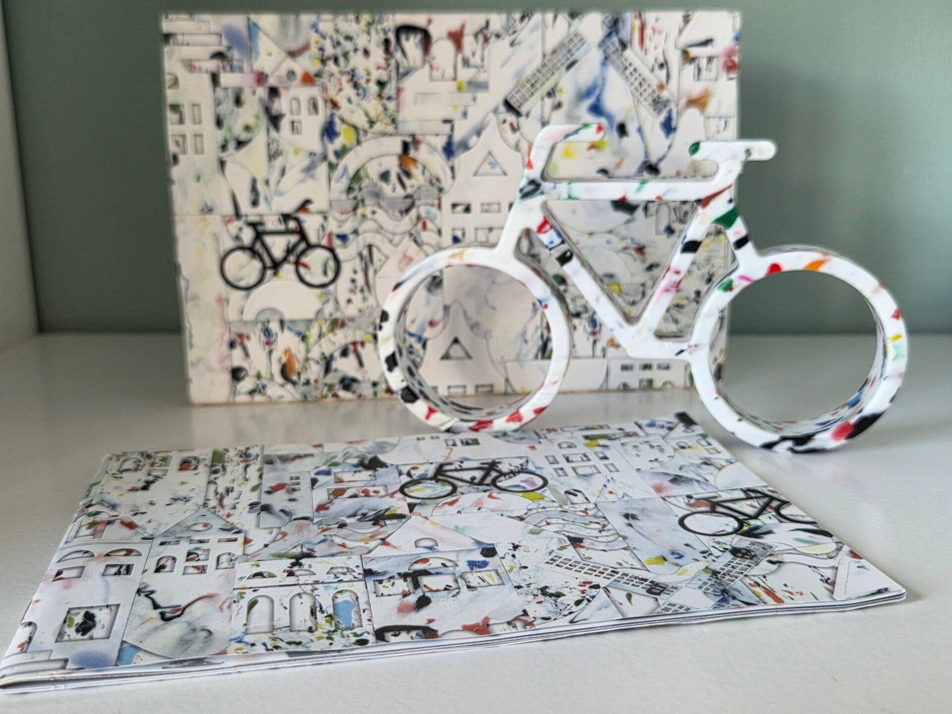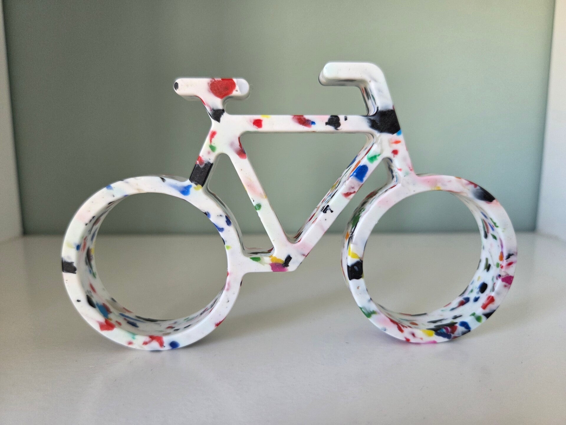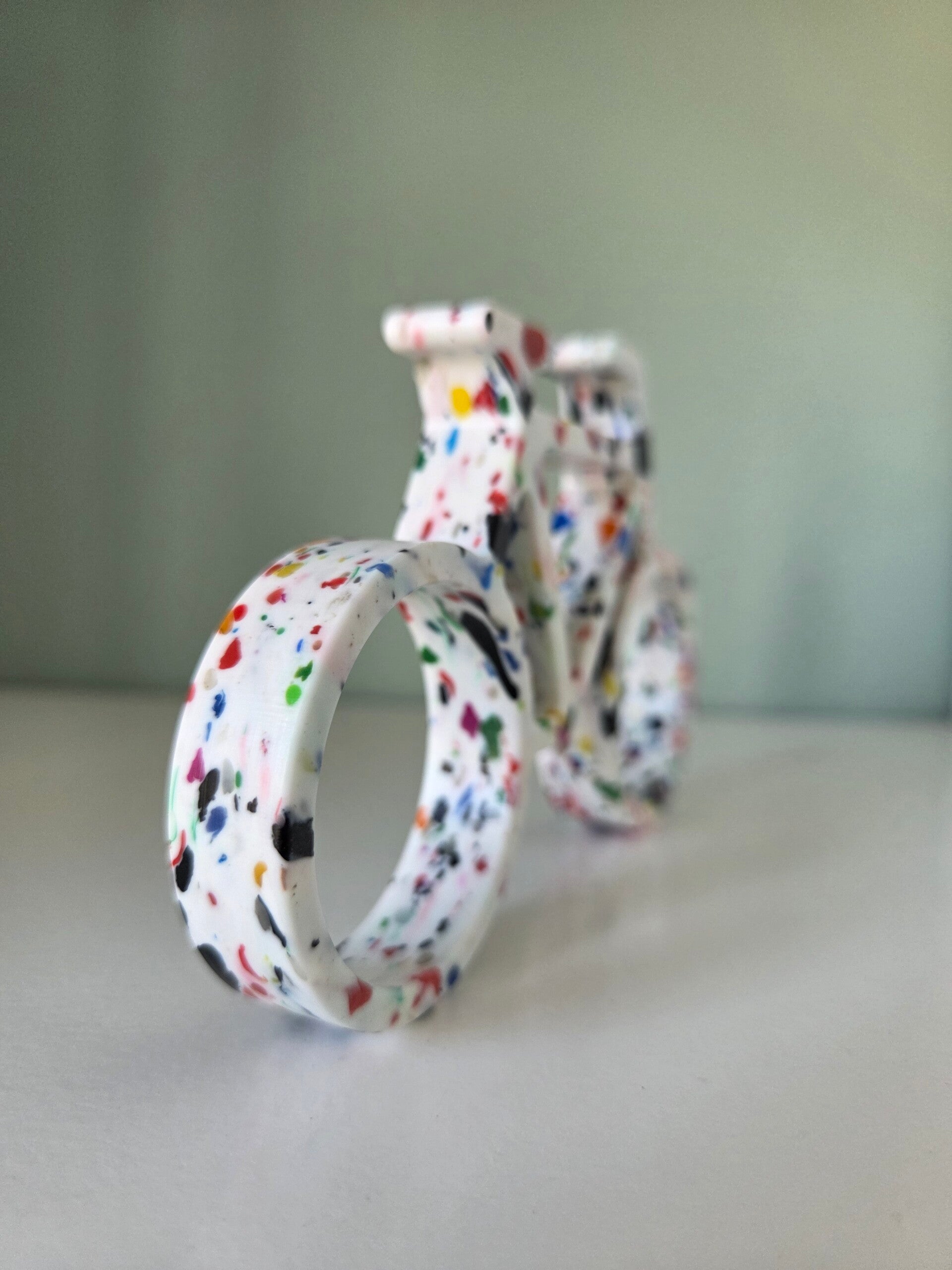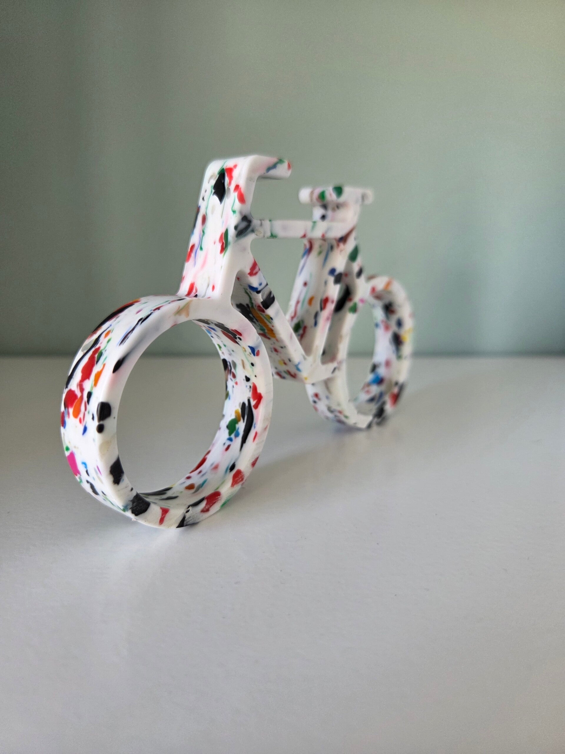 Dit object is een miniatuursculptuur van een fiets, ontworpen door de bekende Nederlandse designer Marcel Wanders.