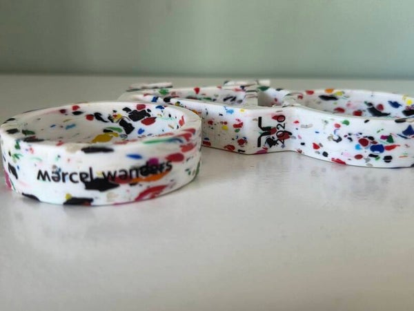 Materiaal: Vervaardigd uit wit gerecycled kunststof met kleurrijke spikkels.