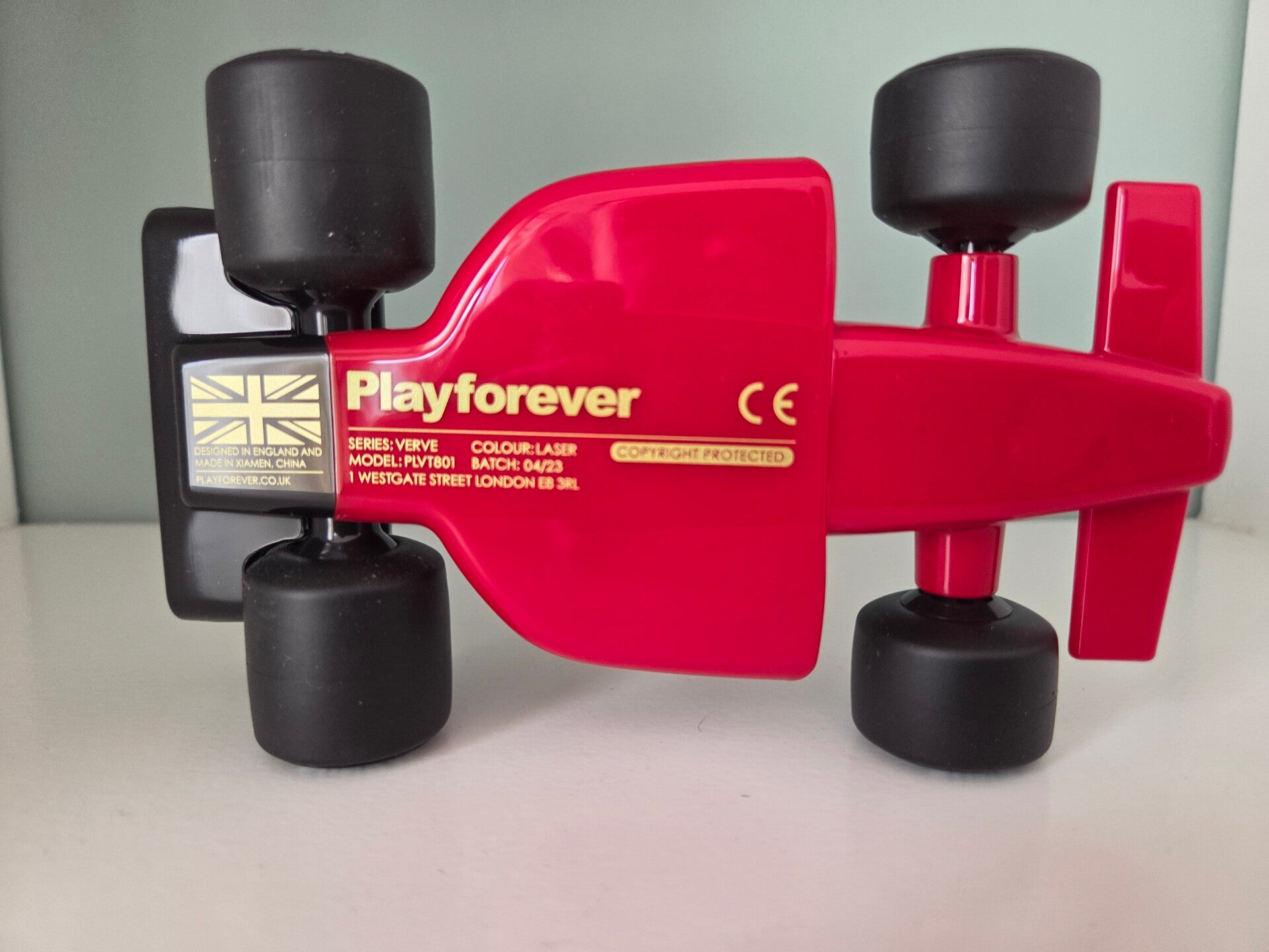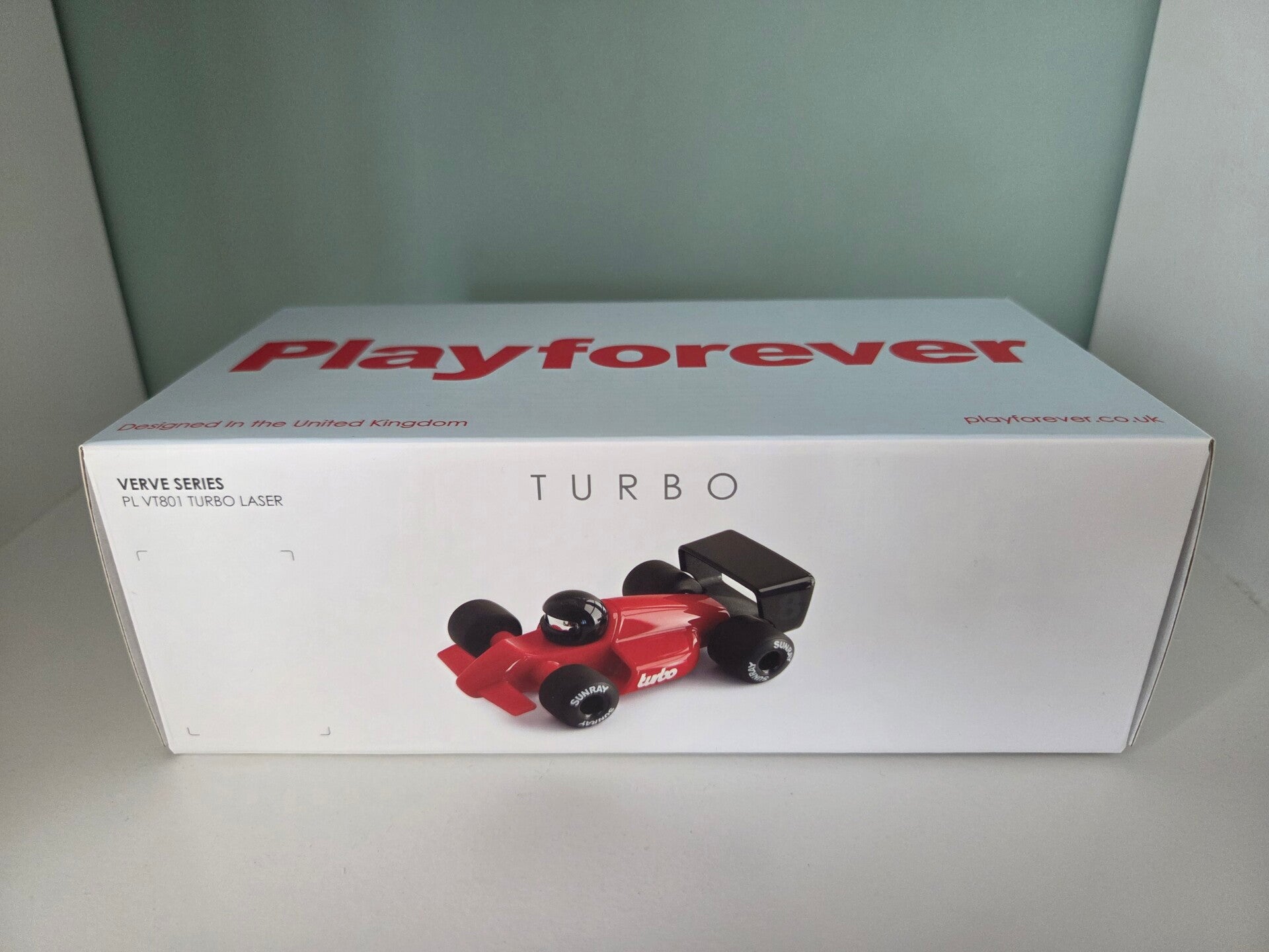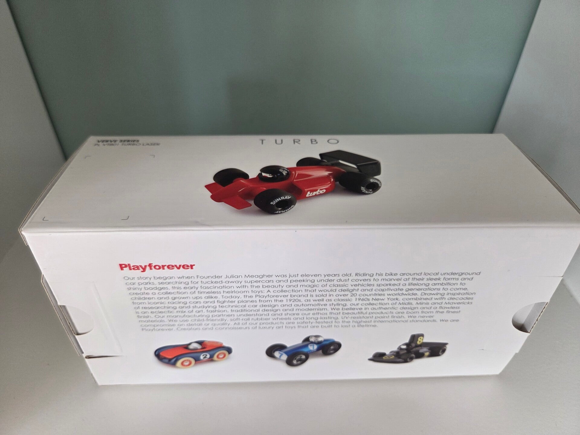 De Playforever Turbo Laser (model PL VT801), een speelgoedauto uit de Verve-serie. Deze rode raceauto is geïnspireerd op de Formule 1-wagens uit de jaren 80, gekenmerkt door een gedurfd ontwerp met grote luchtkanalen en een opvallende achtervleugel.