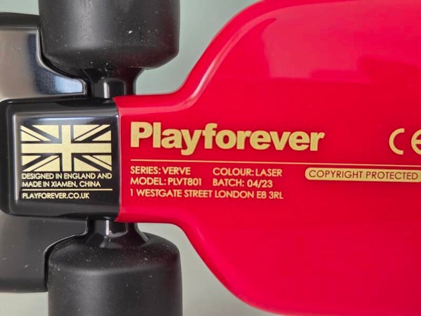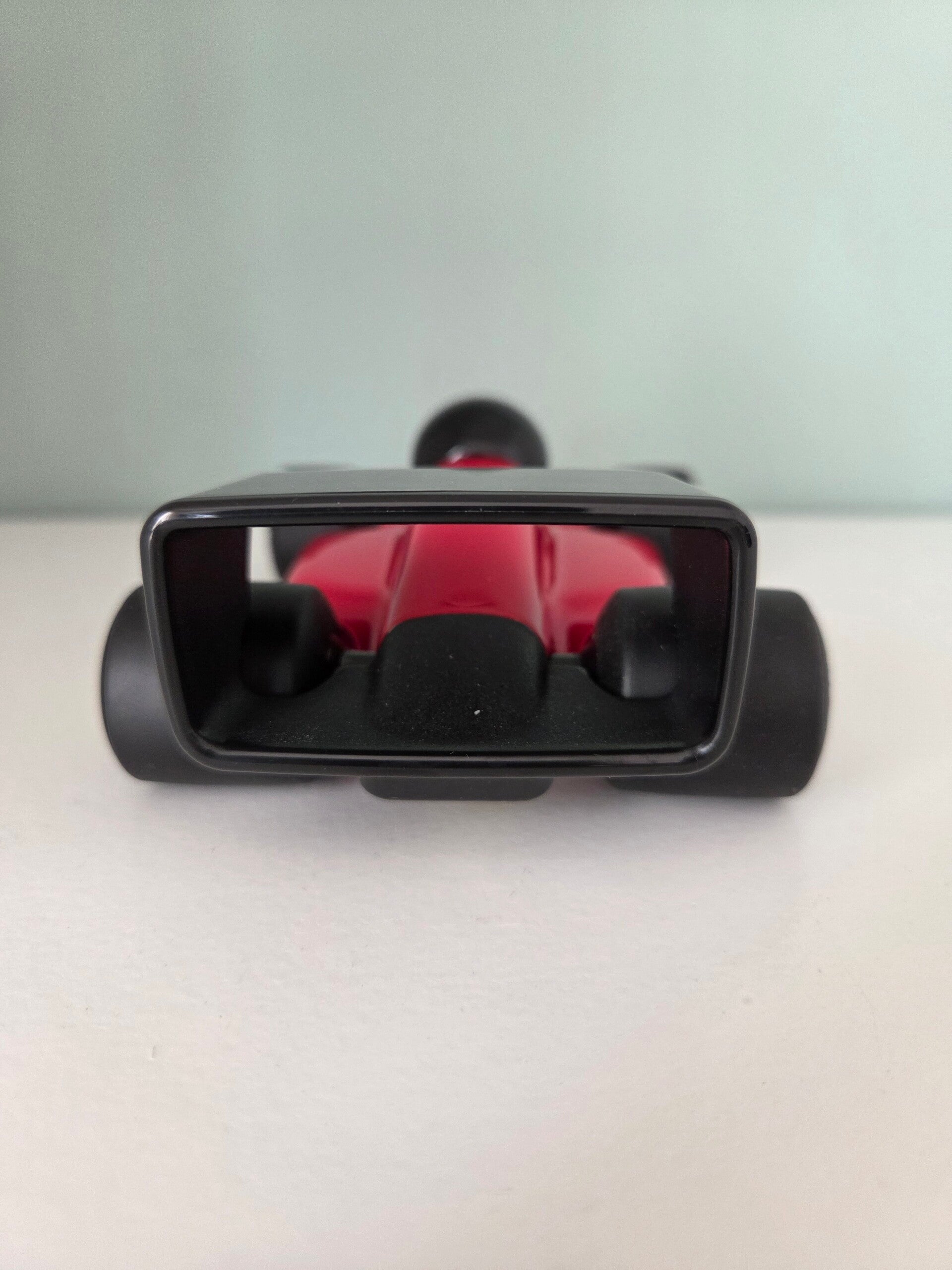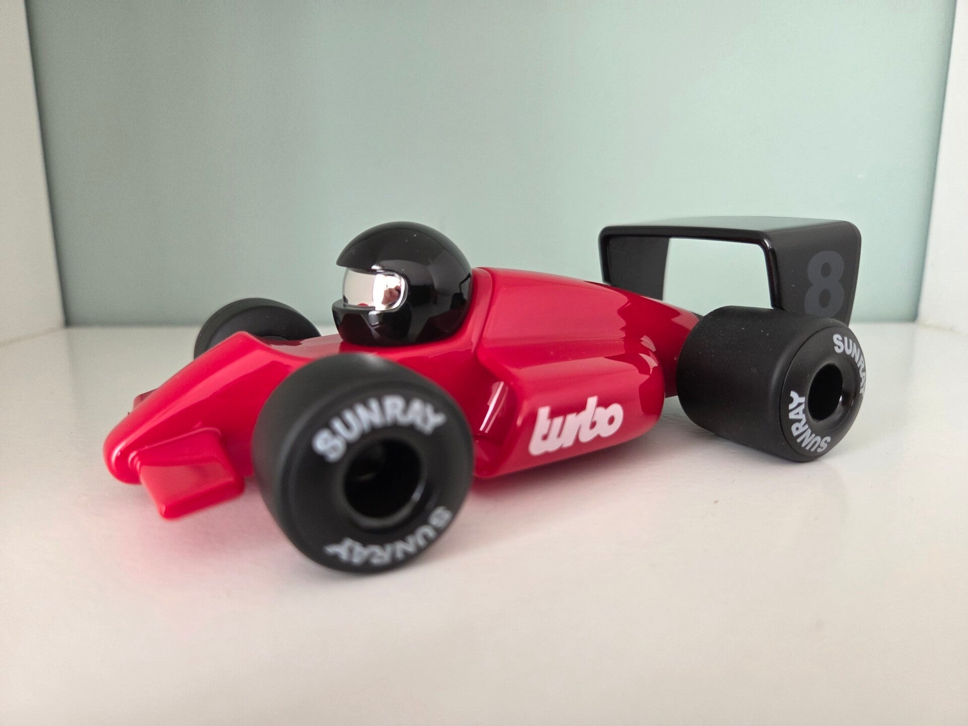 De Playforever Turbo Laser (model PL VT801), een speelgoedauto uit de Verve-serie. Deze rode raceauto is geïnspireerd op de Formule 1-wagens uit de jaren 80, gekenmerkt door een gedurfd ontwerp met grote luchtkanalen en een opvallende achtervleugel.